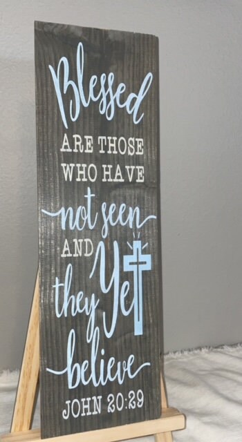 All of our signs are hand cut and painted. Each one is made to order and can be customized. The Blessed Are those who have not seen Yet They Believe sign is roughly 5" x 16". You can lean it as part of a display or hang it on the wall.