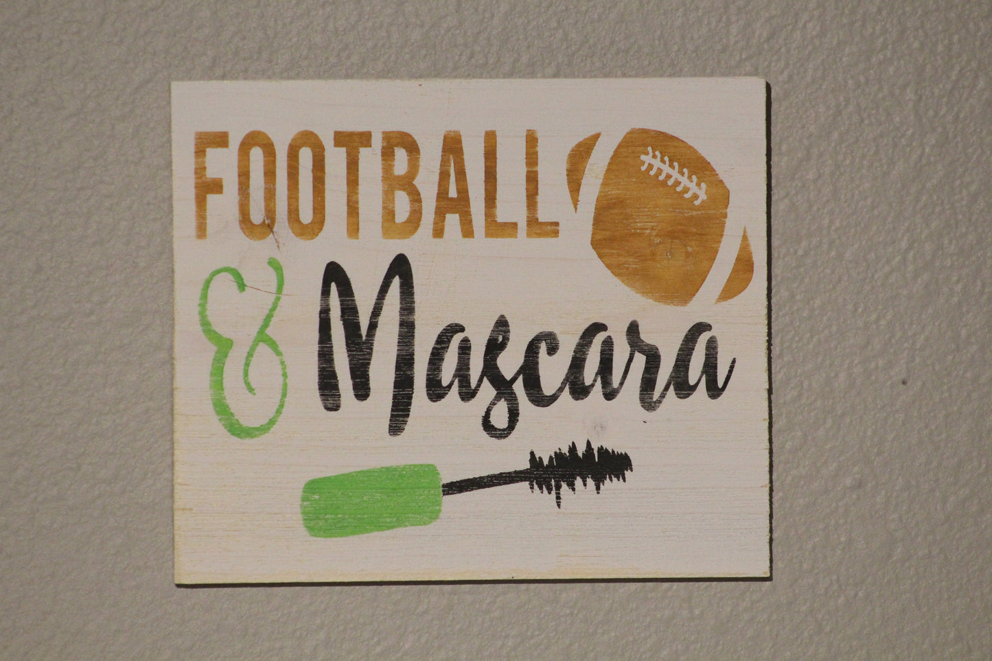 All of our signs are hand cut and painted. Each one is made to order and can be customized. Want a different size? How about specific colors to match your decor? Shoot us a message with your order and we'll get it done! The Football & Mascara sign is roughly 5" x 6". Graphic is painted on a whitewash background.