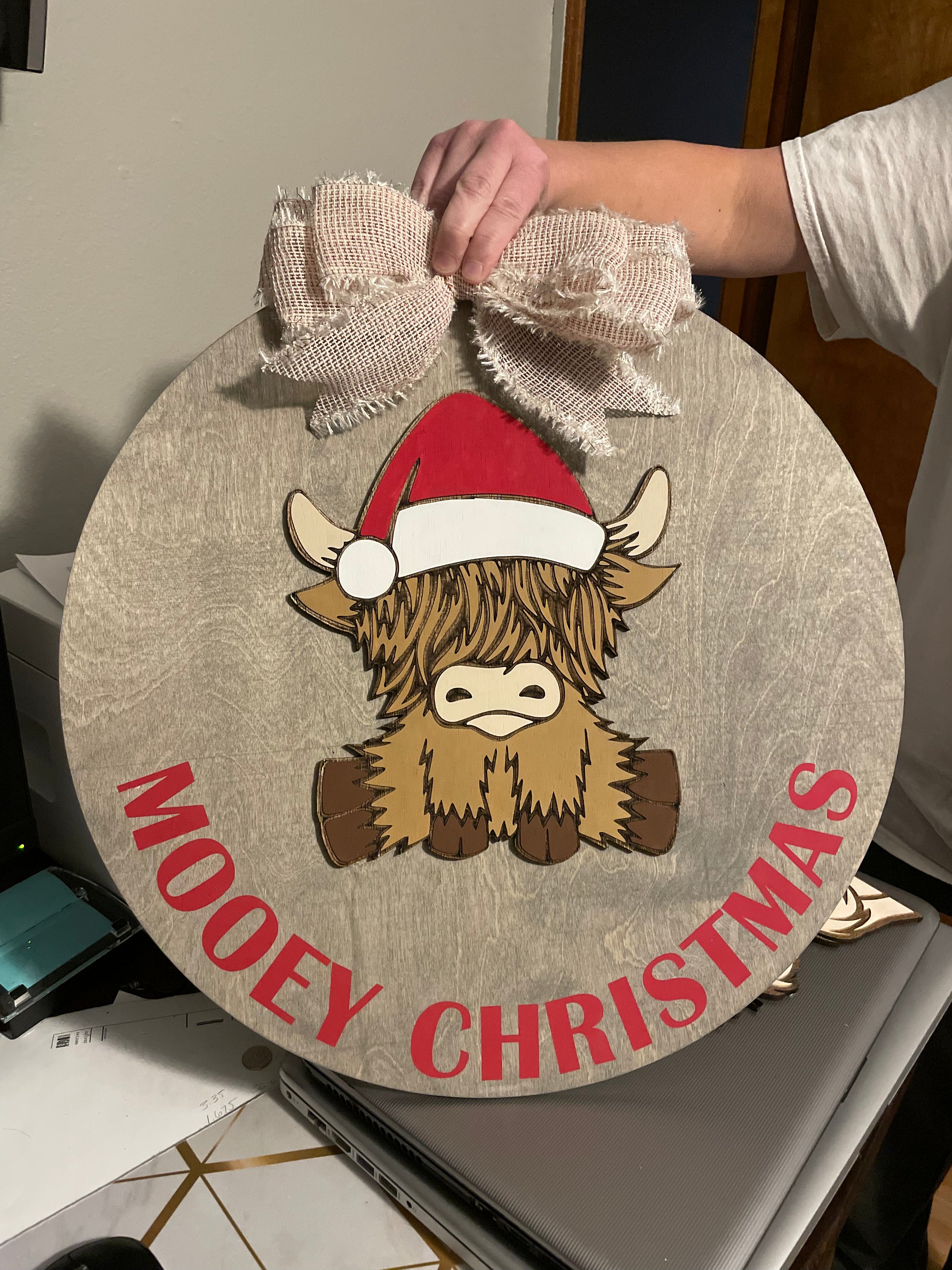 Listing is for (1) 18” round 3D Mooey Christmas with cow wood sign.