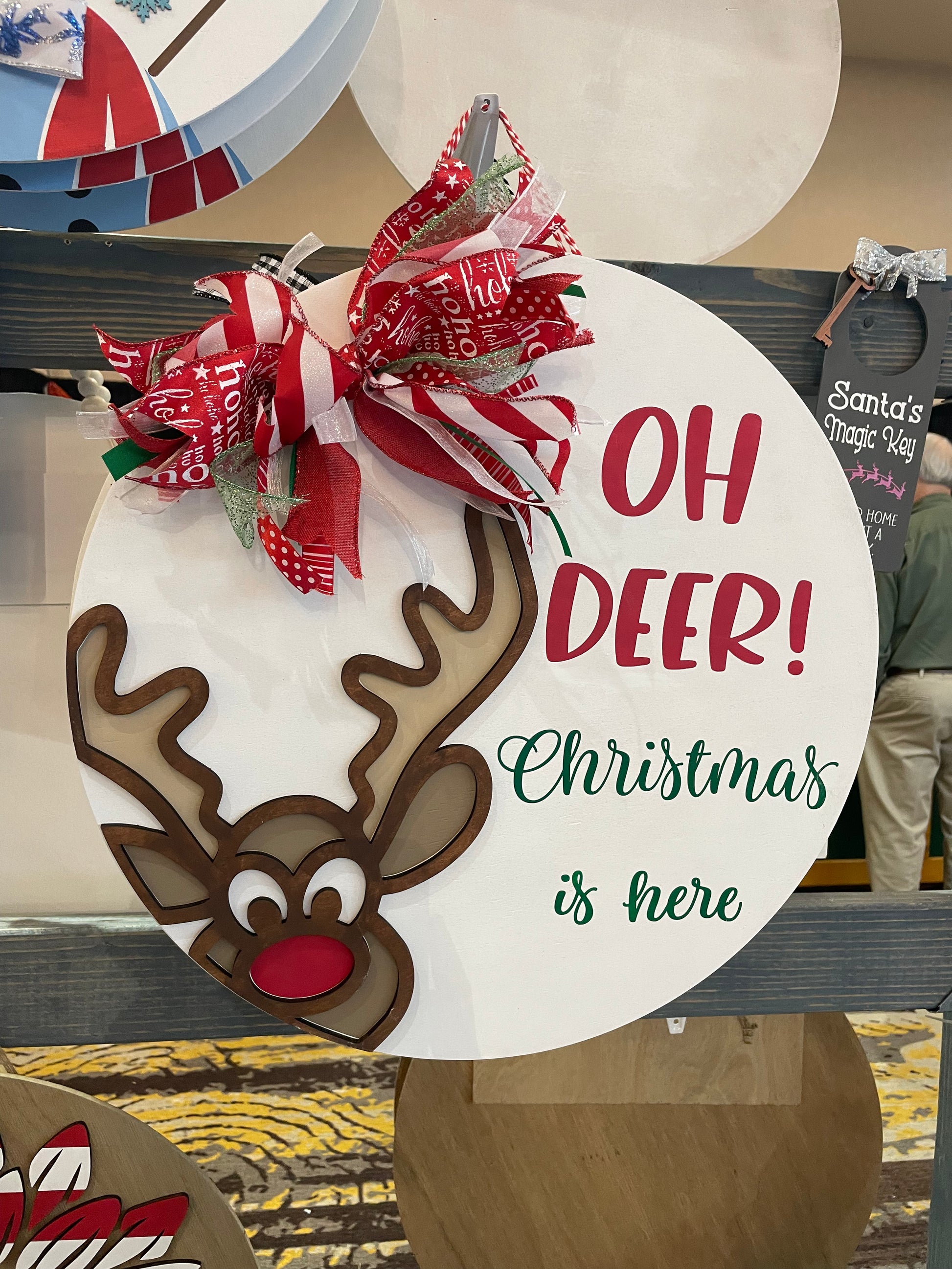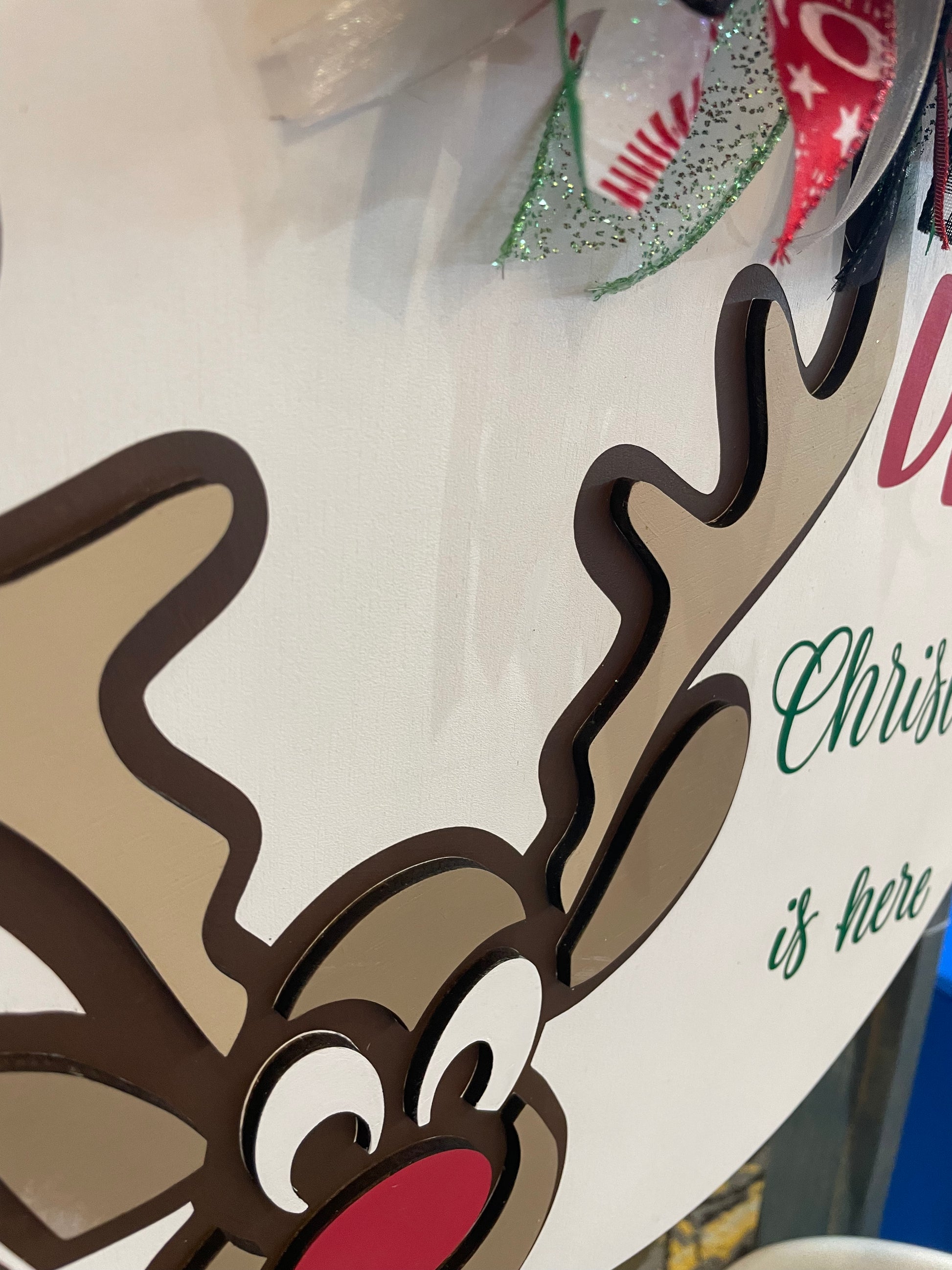 Laser cut, hand painted Oh Deer! Christmas is here on a white base. 18” diameter.