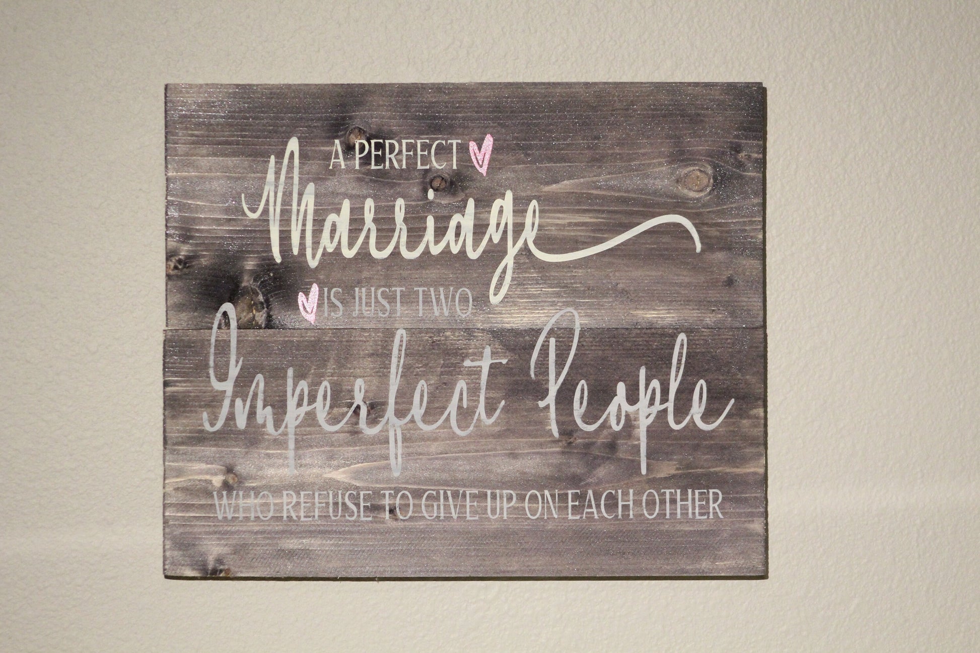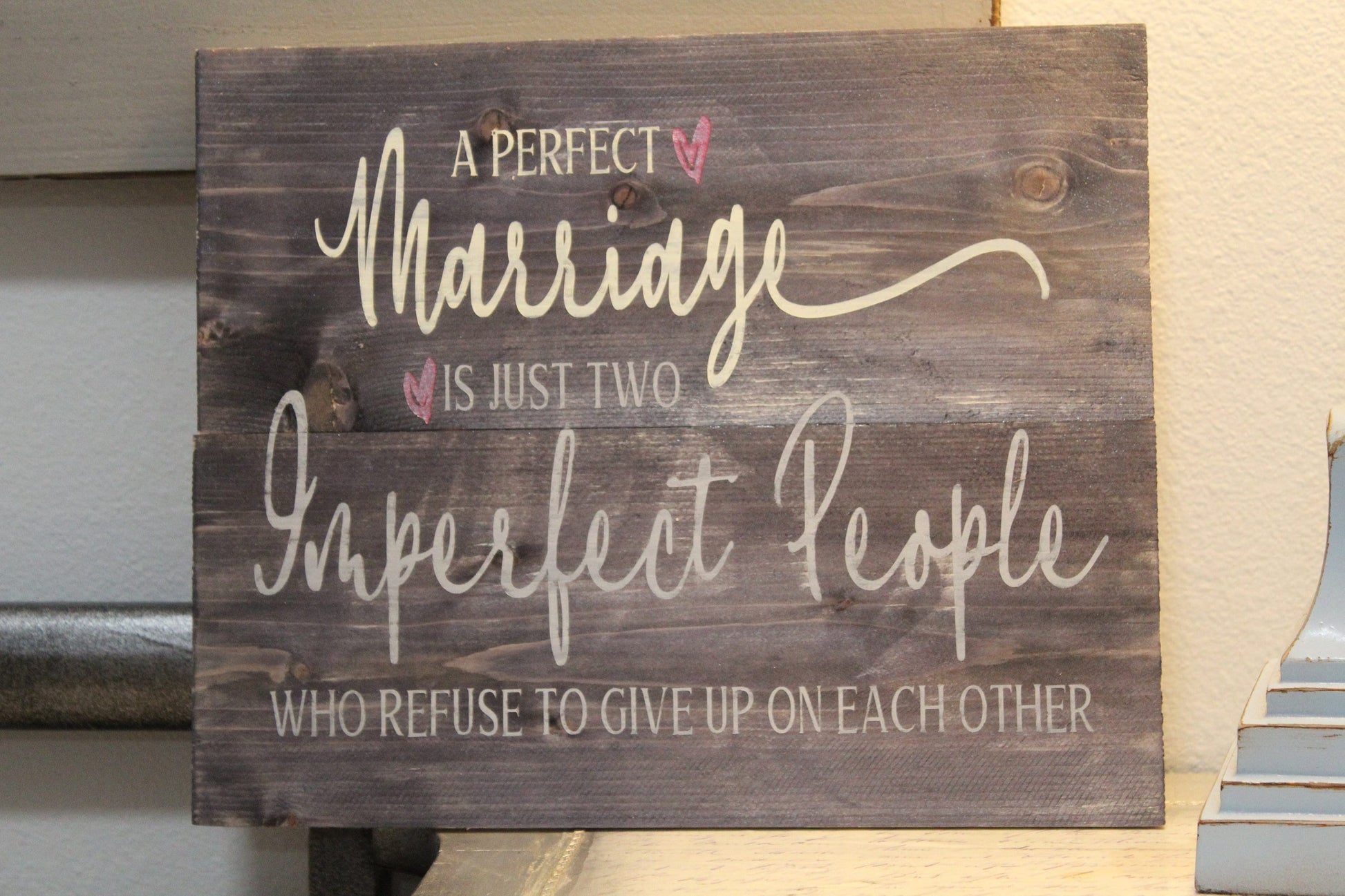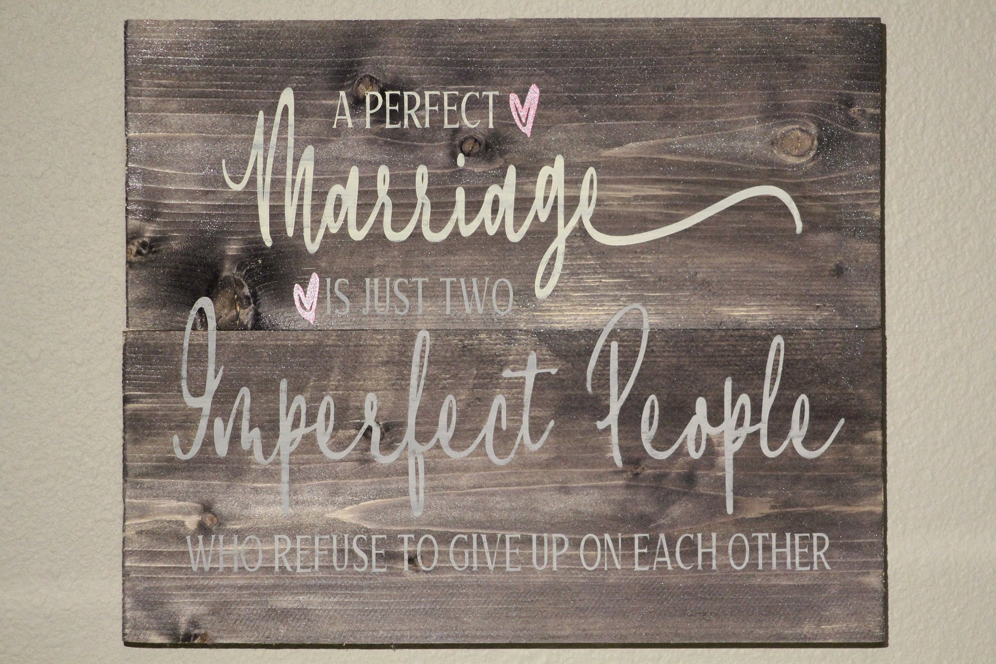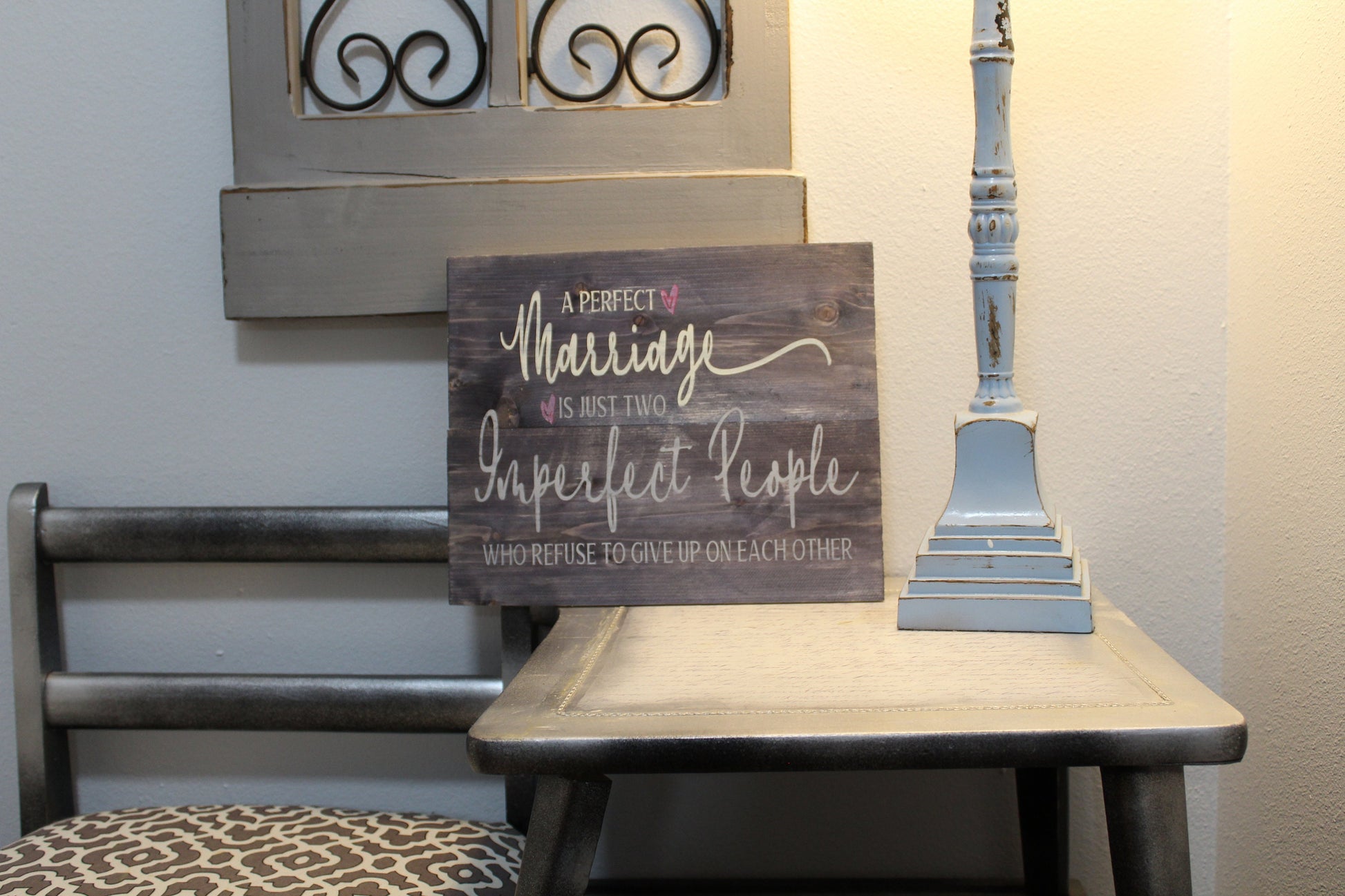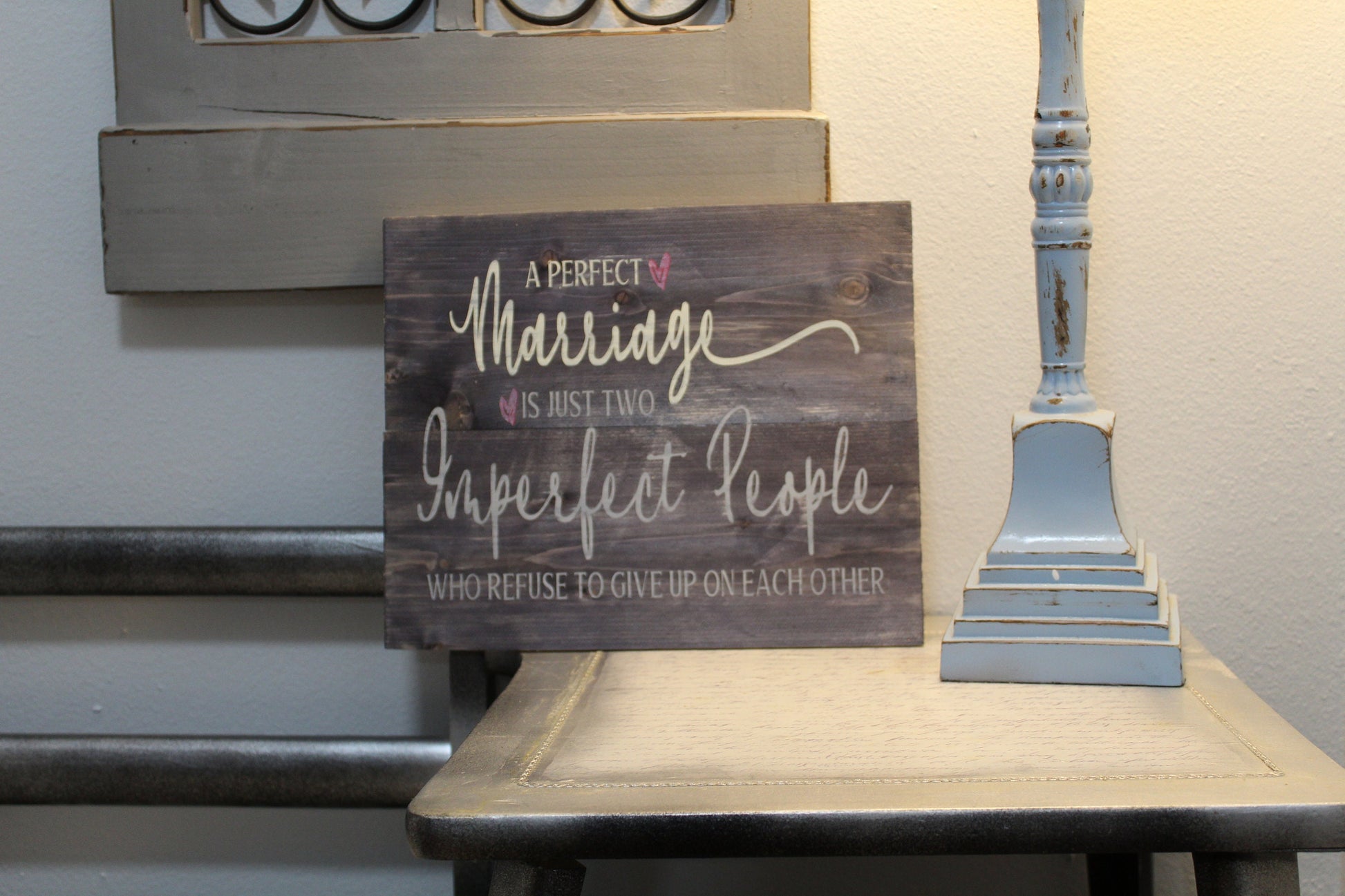 All of our signs are hand cut and painted. Each one is made to order and can be customized. This A Perfect Marriage is just two Imperfect People who refuse to give up on each other sign is roughly 10" x 12". You can lean it as part of a display or hang it on the wall. Can also be personalized.