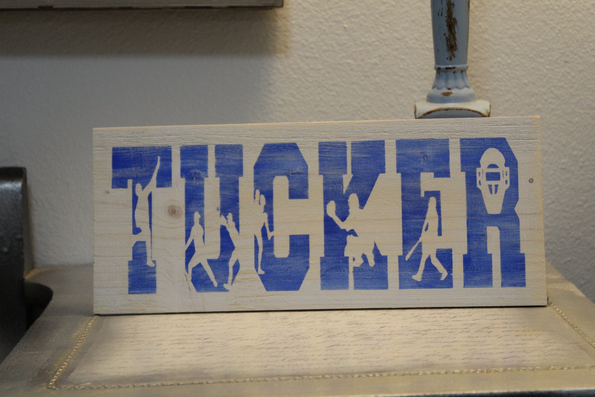 All of our signs are hand cut and painted. Each one is made to order and can be customized. Want a different size? How about specific colors to match your decor? Shoot us a message with your order and we'll get it done! The Personalized name sign with baseball/softball letters is roughly 5" x 12". Sign shown is painted on a whitewash background.