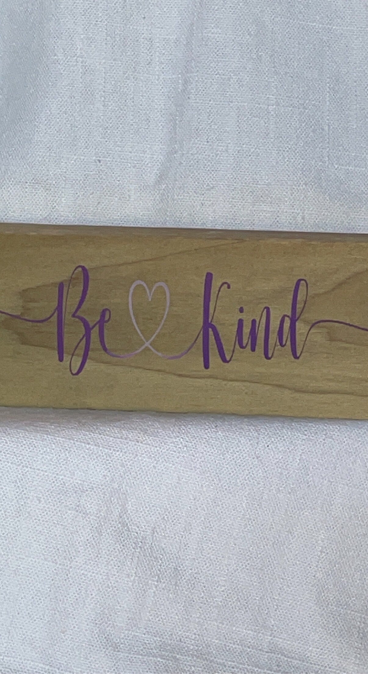 All of our signs and blocks are hand painted. Each one is made to order and can be customized. Want a different size? How about specific colors to match your decor? Shoot us a message with your order and we'll get it done! Be Kind display block is roughly 2 1/2" x 6 1/2" and painted on natural wood. Be sure to select whether you want hardware for hanging or not.