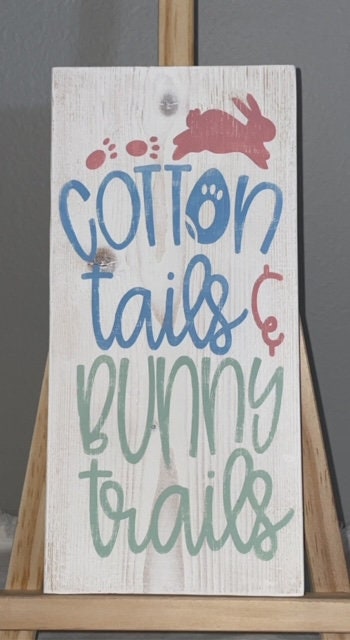 All of our signs and blocks are hand painted. Each one is made to order and can be customized. Want a different size? How about specific colors to match your decor? Shoot us a message with your order and we’ll get it done! Cotton Tails & Bunny Trails sign is roughly 5” x10” and painted on a whitewash background.