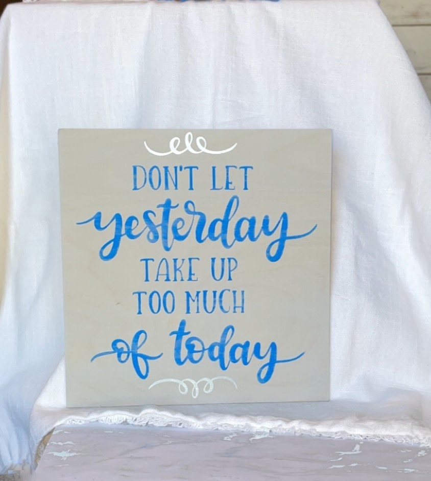 All of our signs and blocks are hand painted. Each one is made to order and can be customized. Want a different size? How about specific colors to match your decor? Shoot us a message with your order and we'll get it done! The Don't Let Yesterday take up too much of Today sign is roughly 10" x 9" and painted on a rain grey wash.