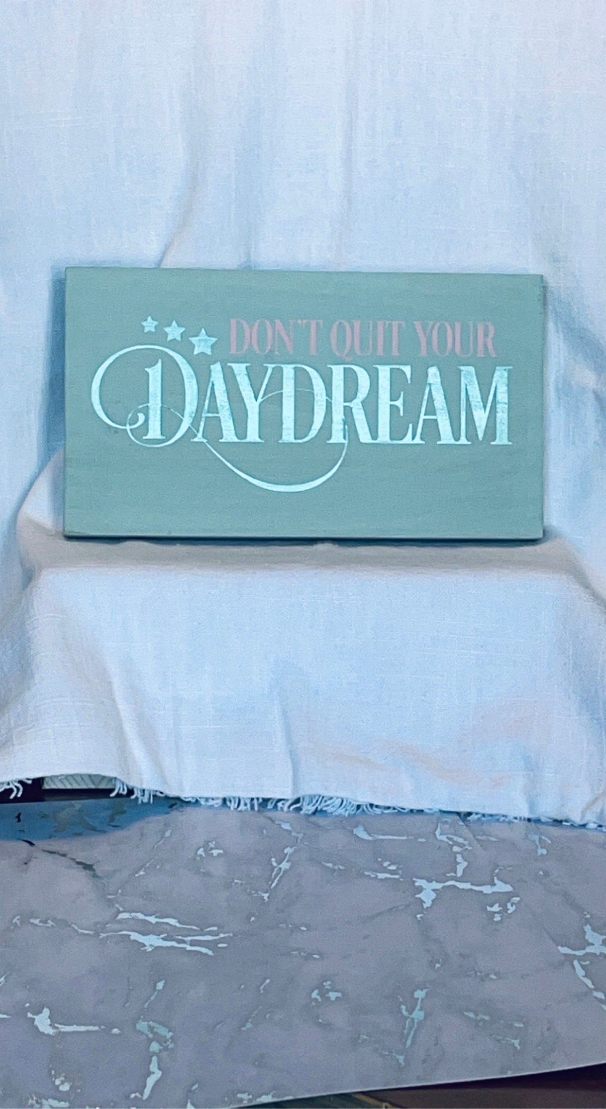 All of our signs and blocks are hand painted. Each one is made to order and can be customized. Want a different size? How about specific colors to match your decor? Shoot us a message with your order and we'll get it done! The Don't Quit Your Daydream display block is roughly 4" x 8" and painted on a sea foam wash background. Photo shown has Daydream and Stars are in a Metallic Aquamarine color.