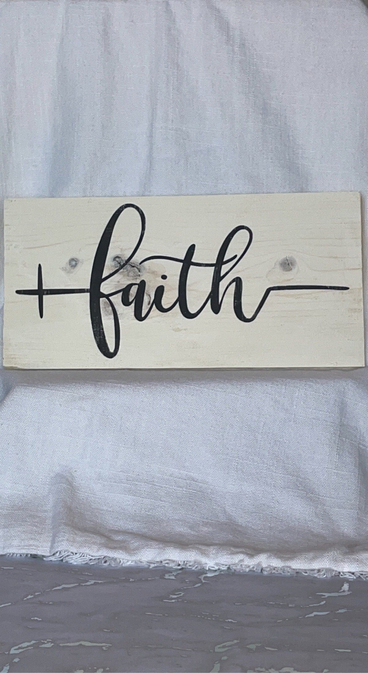 All of our signs are hand cut and painted. Each one is made to order and can be customized. Want a different size? How about specific colors to match your decor? Shoot us a message with your order and we'll get it done! The Faith with cross sign is roughly 5" x 10". Sign pictured is painted on a whitewash background.