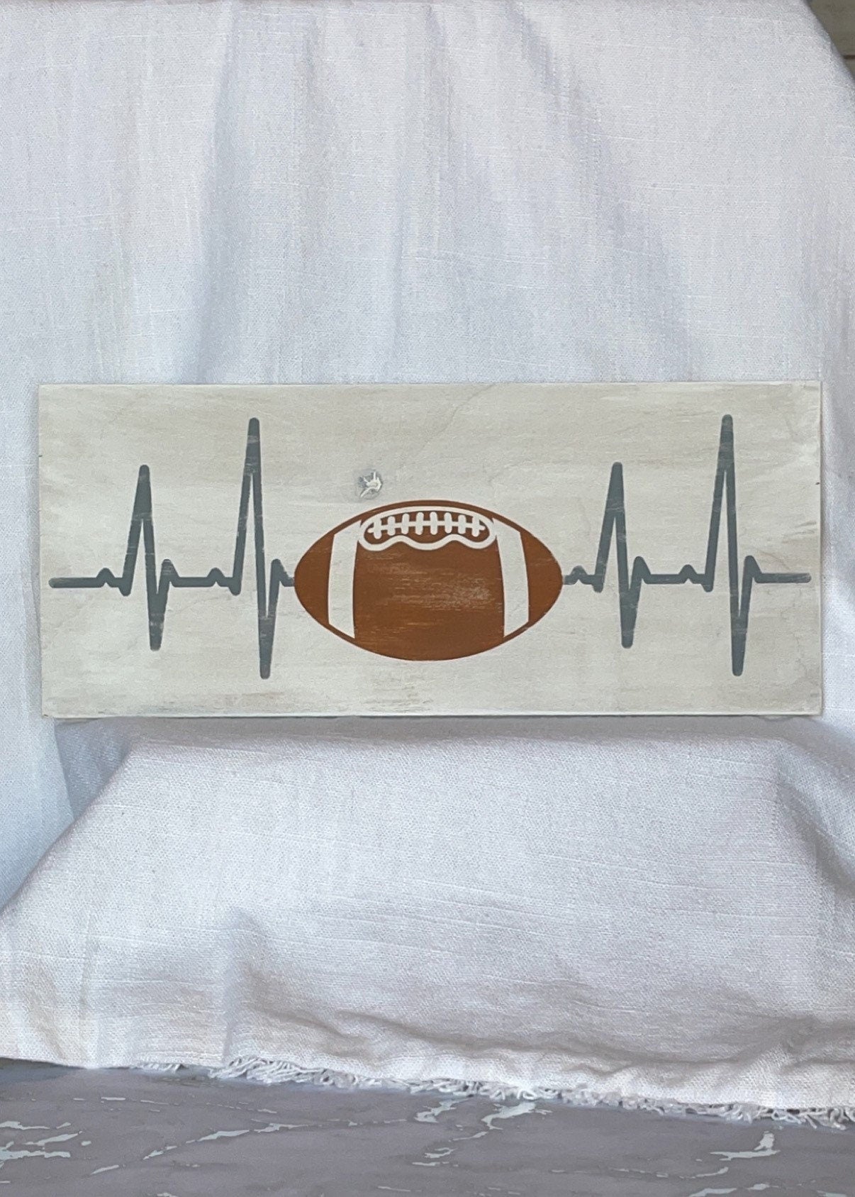 All of our signs are hand cut and painted. Each one is made to order and can be customized. Want a different size? How about specific colors to match your decor? Shoot us a message with your order and we'll get it done! The Football Heartbeat sign is roughly 4.5" x 11.5". Graphic is painted on a whitewash background.