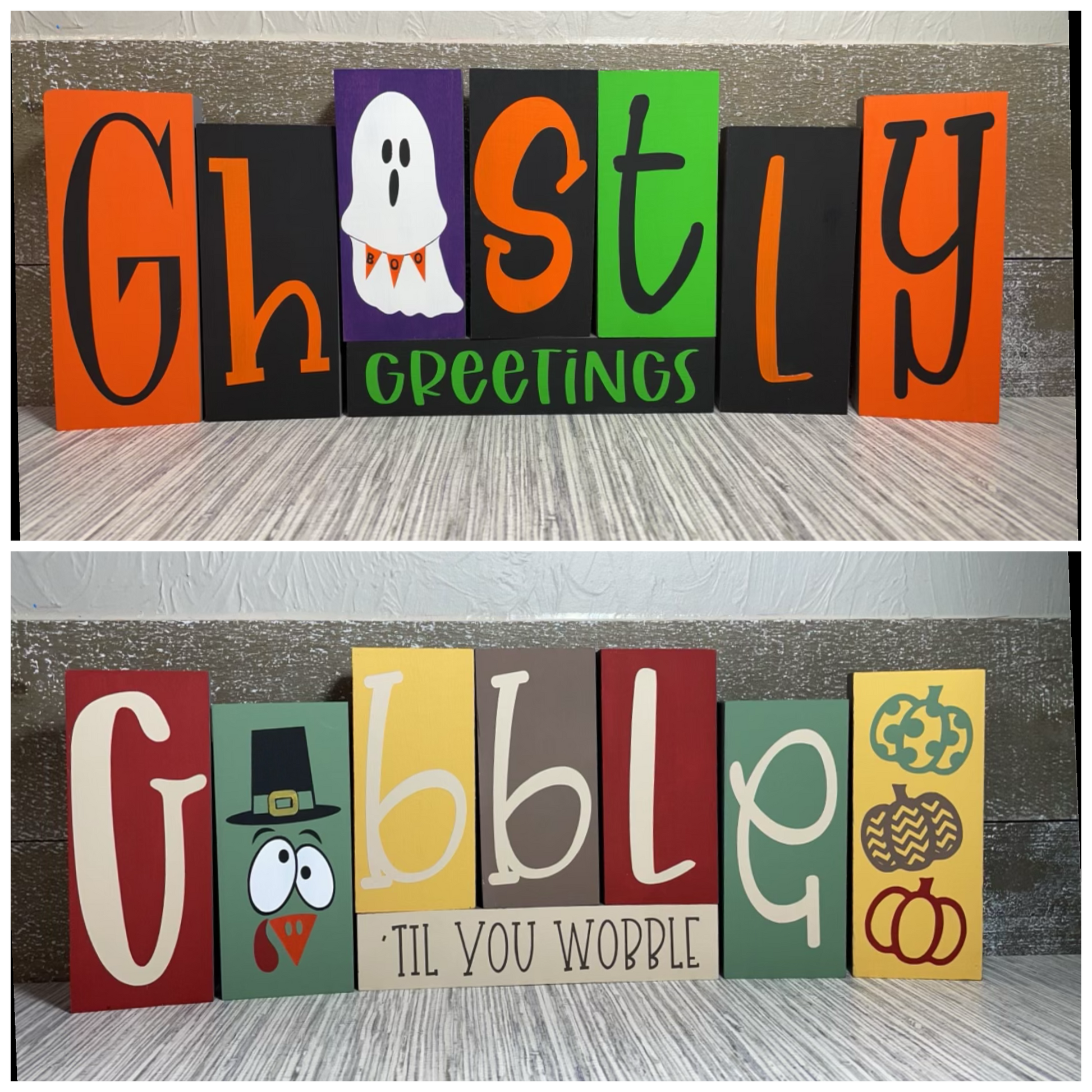 Listing is for (1) Ghostly Greetings on one side and Gobble Til You Wobble on the other side wood blocks. There are 8 blocks all together. **SET IS REVERSIBLE** Completely hand painted.