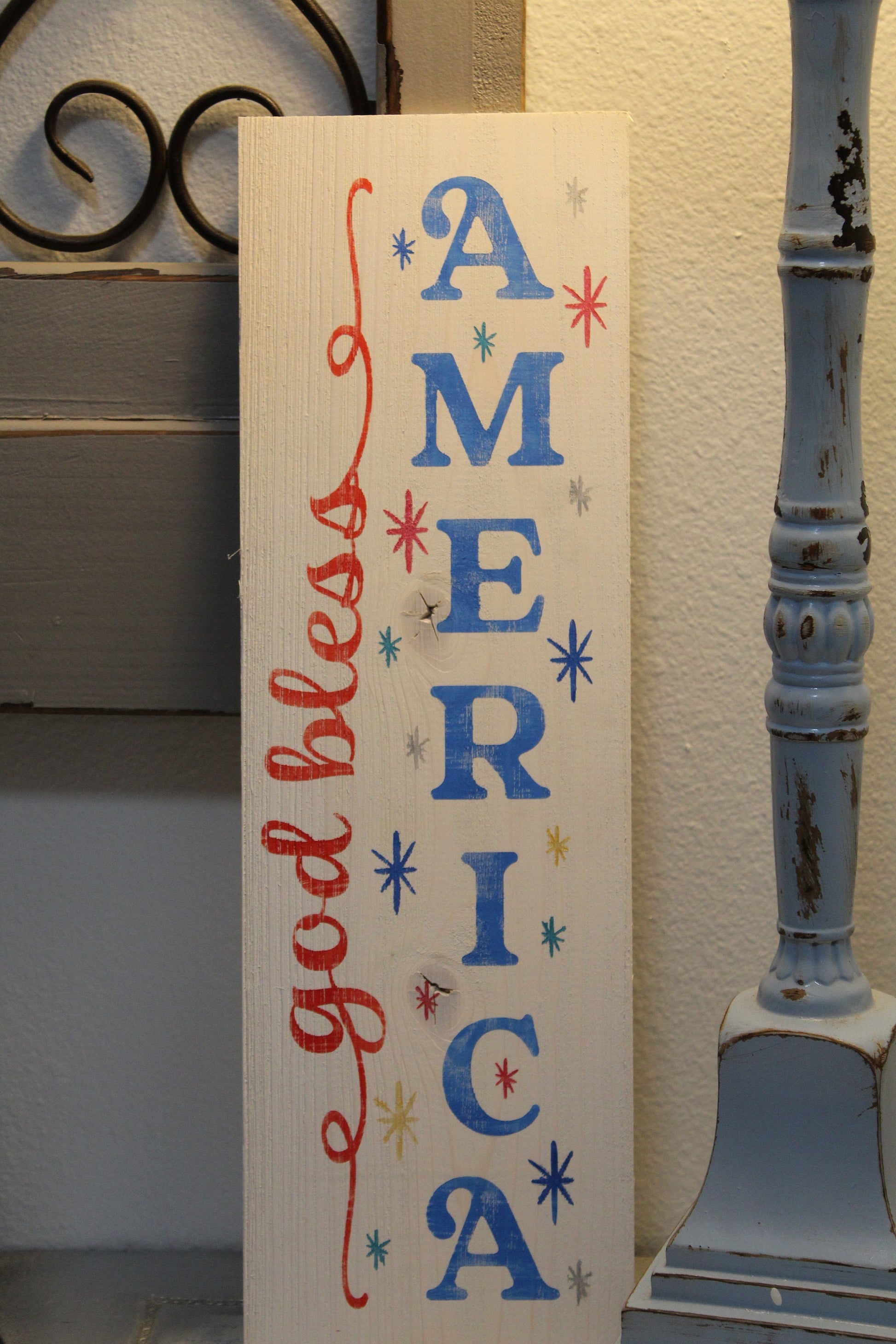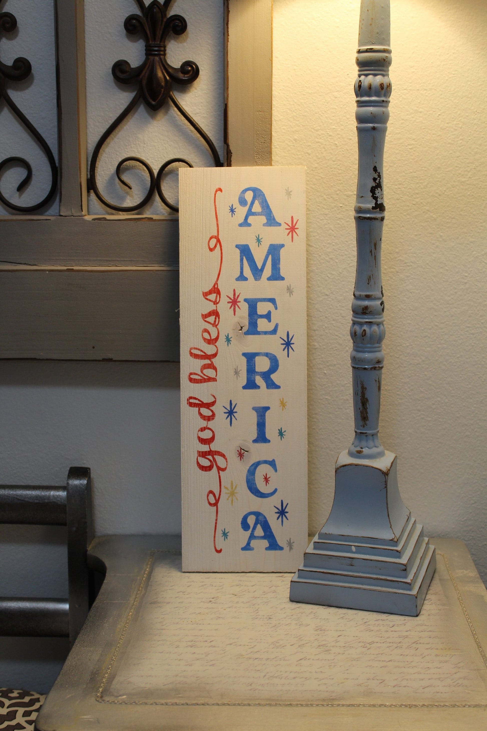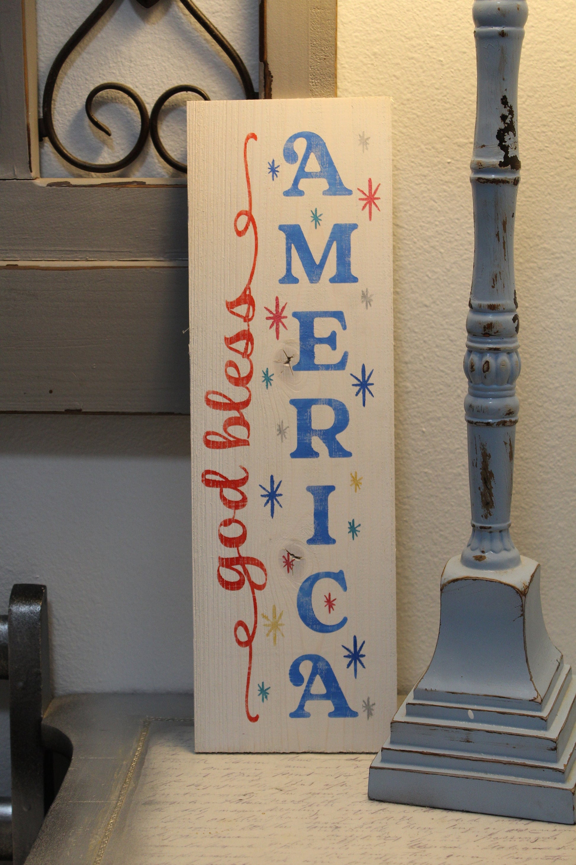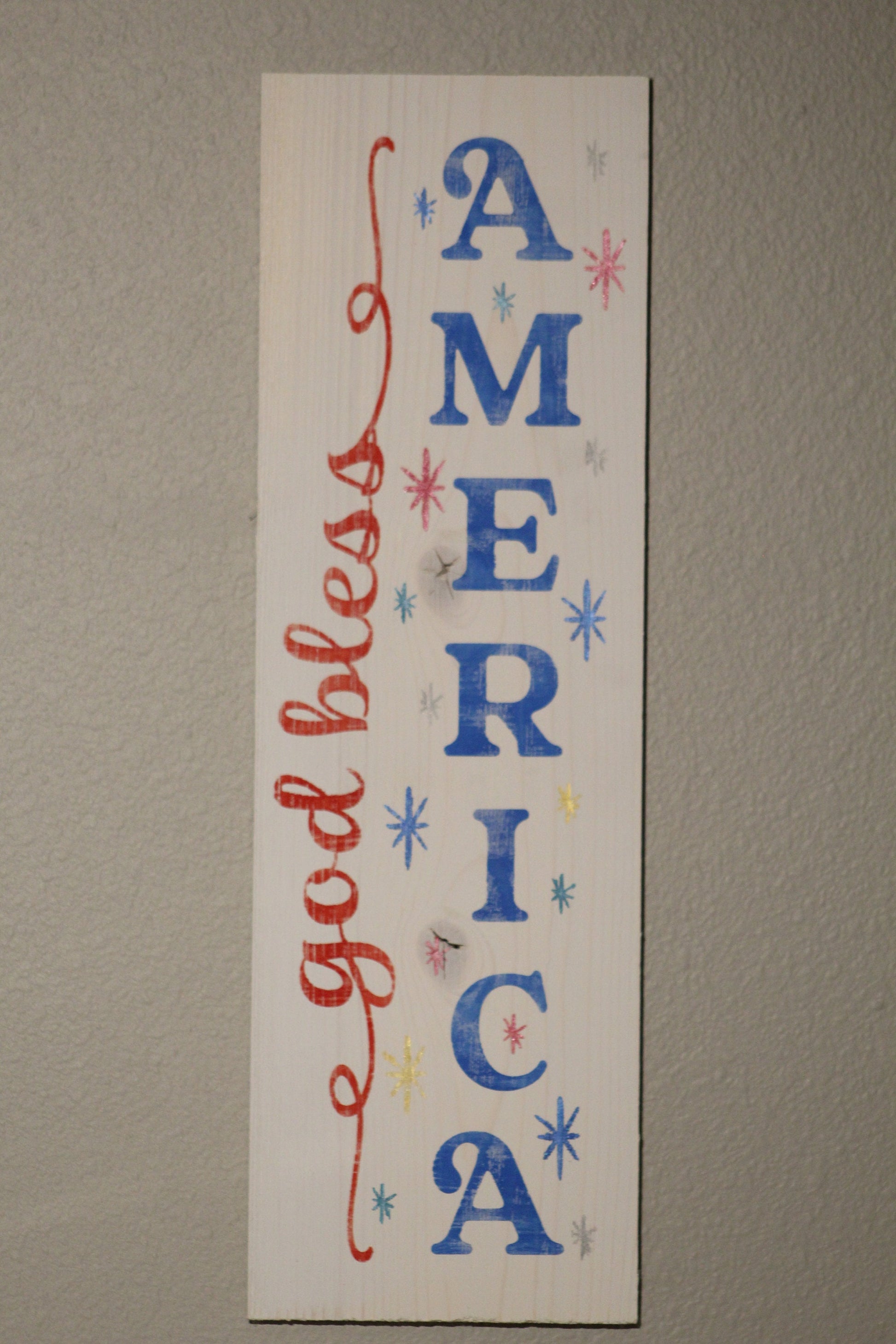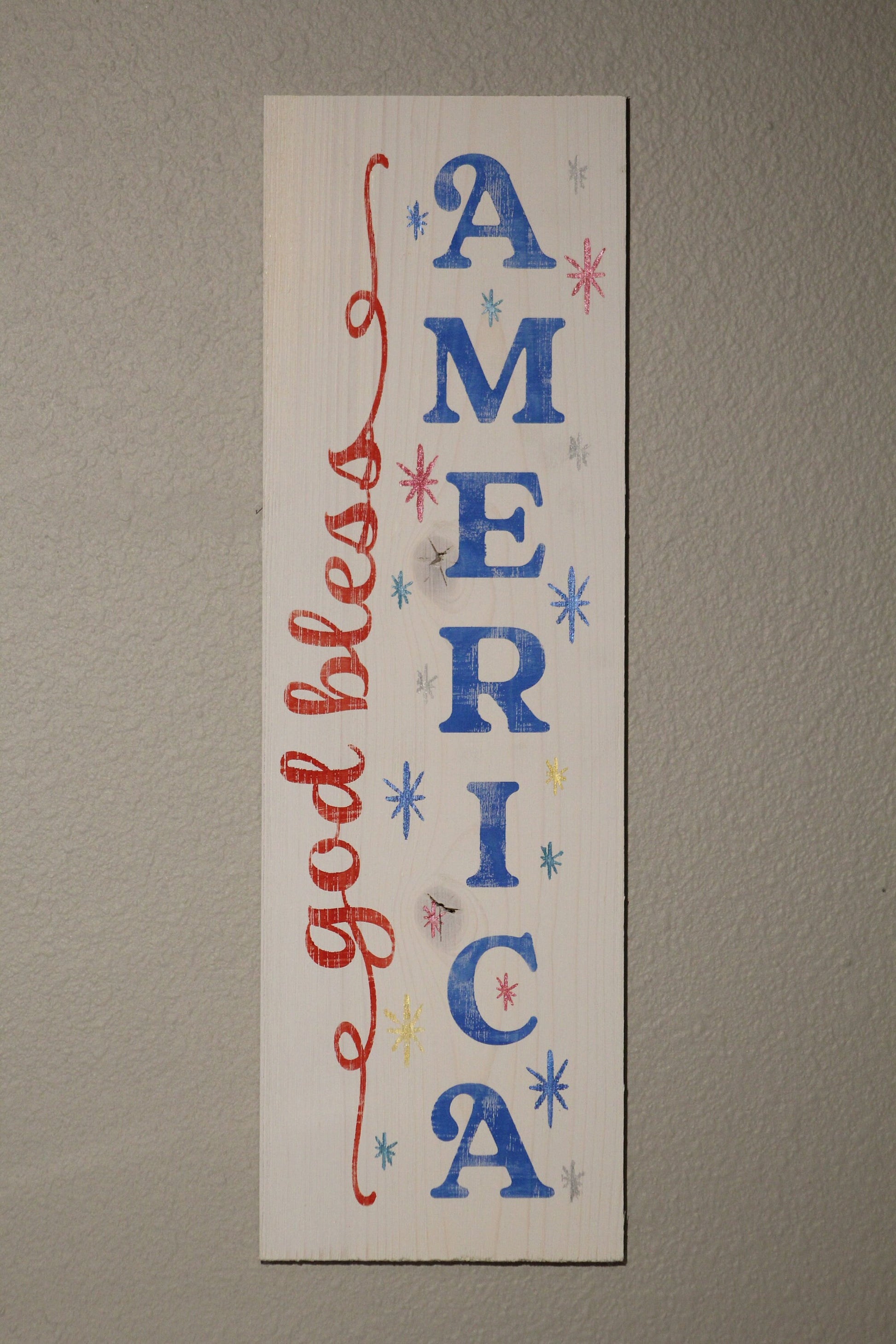 All of our signs are hand cut and painted. Each one is made to order and can be customized. This God Bless America sign is roughly 5" x 16". You can lean it as part of a display or hang it on the wall.