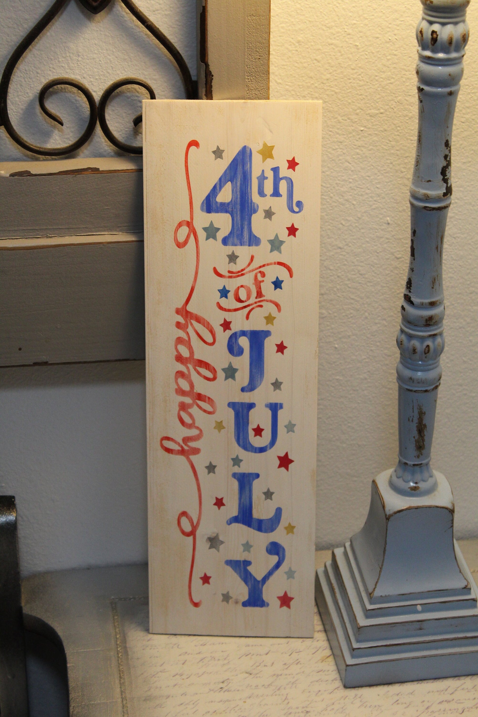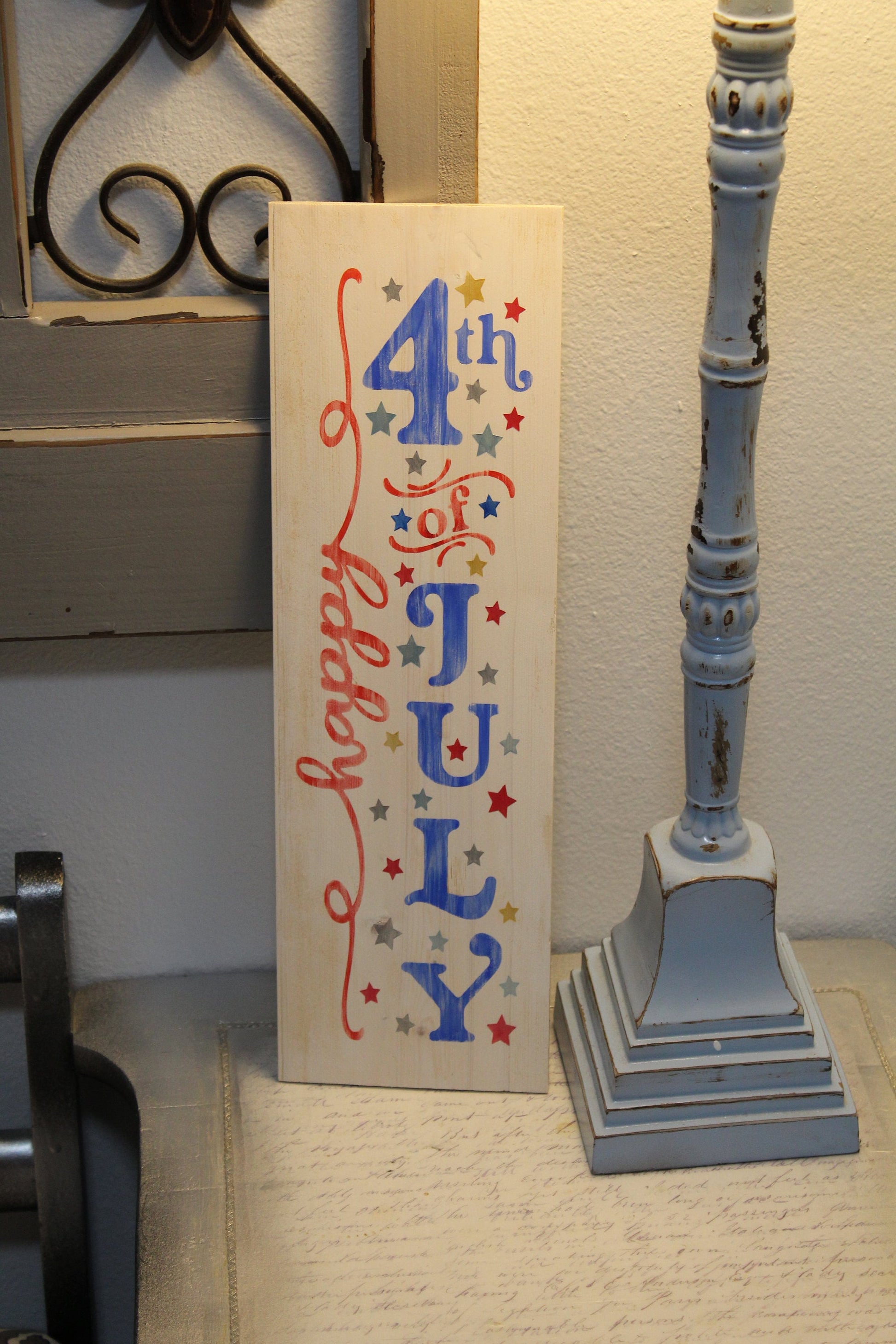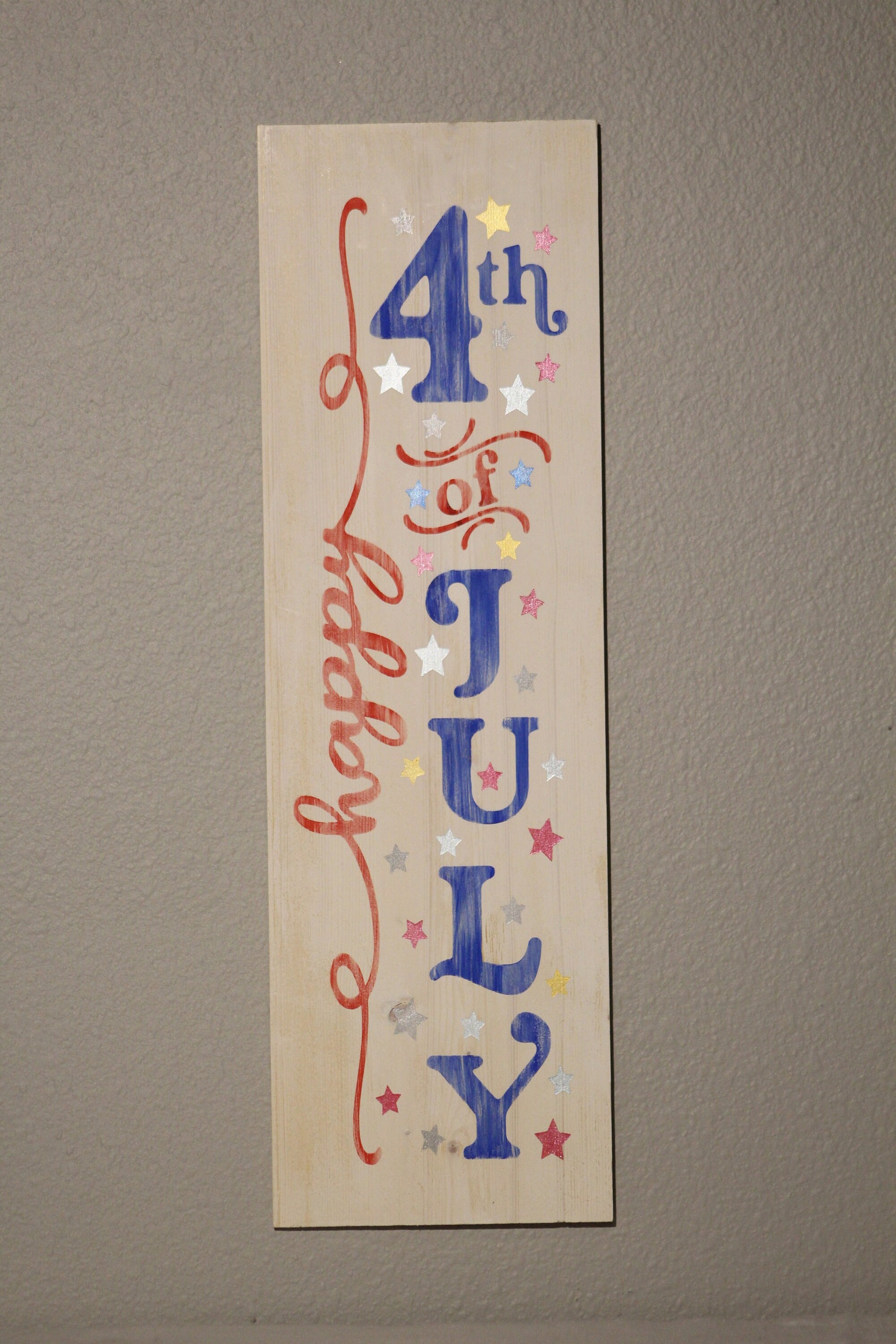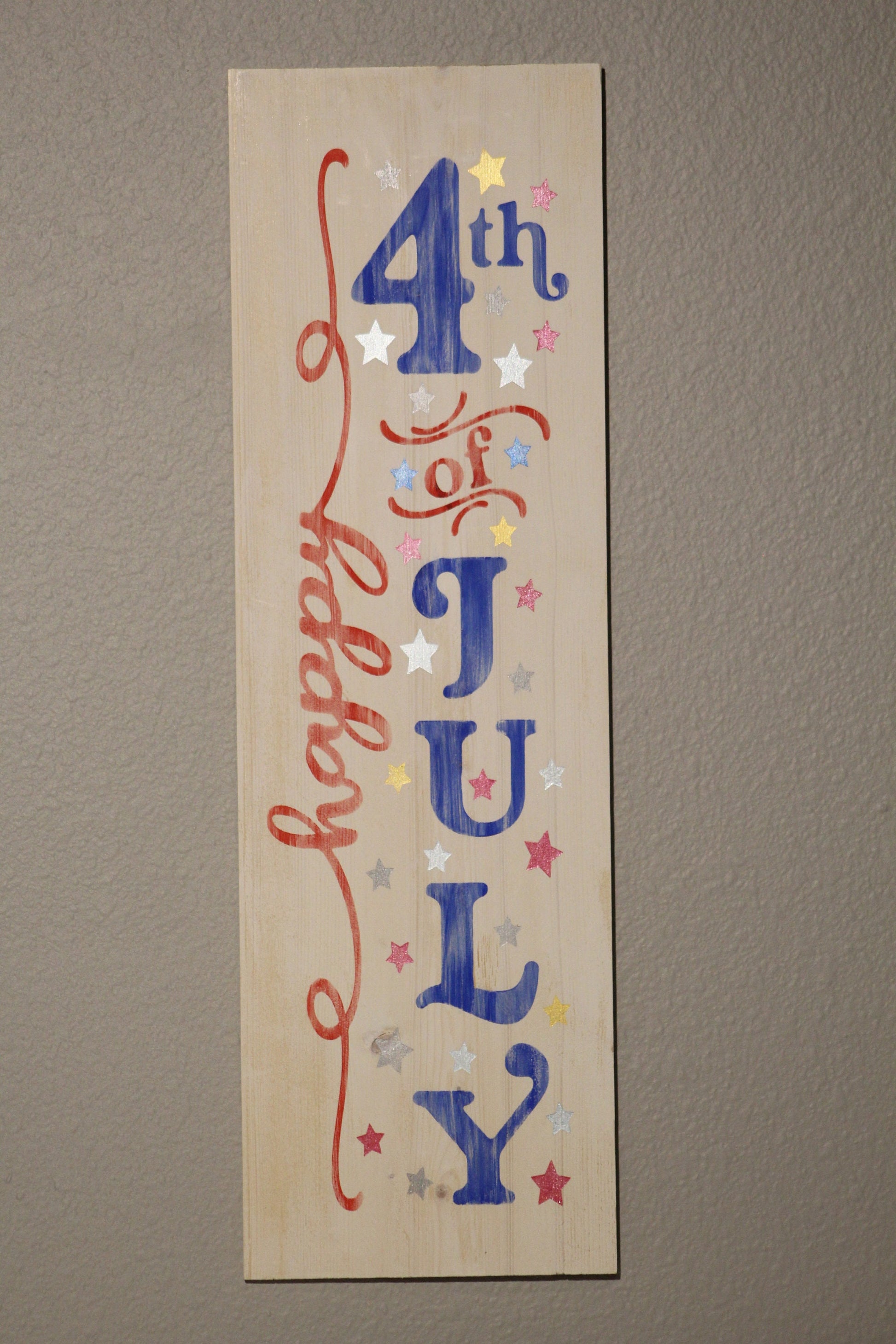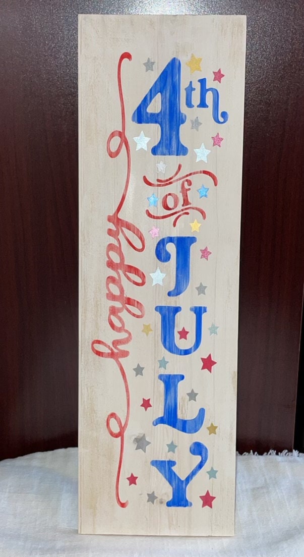 All of our signs are hand cut and painted. Each one is made to order and can be customized. The Happy4th of July sign is roughly 5" x 16". You can lean it as part of a display or hang it on the wall.