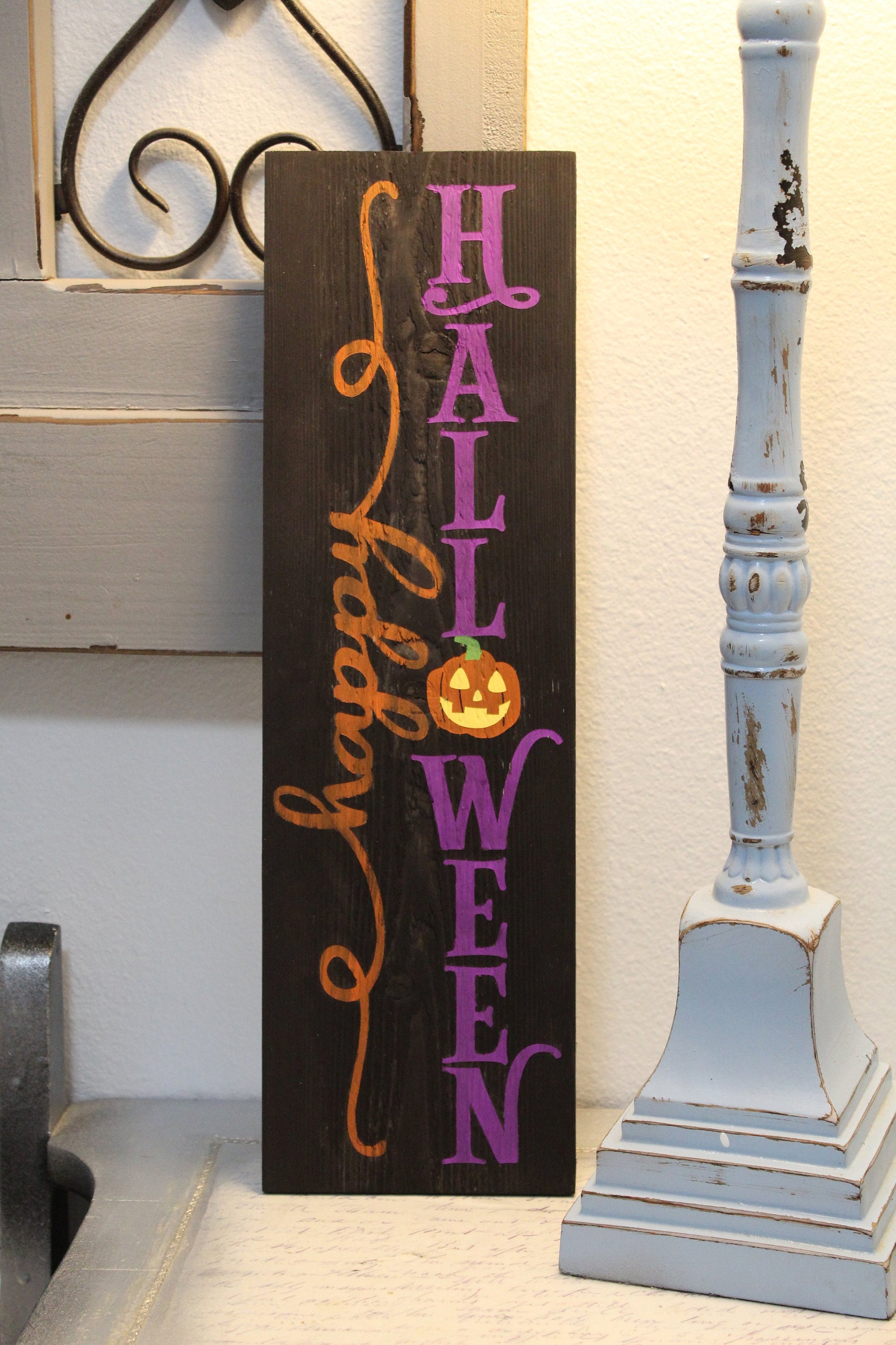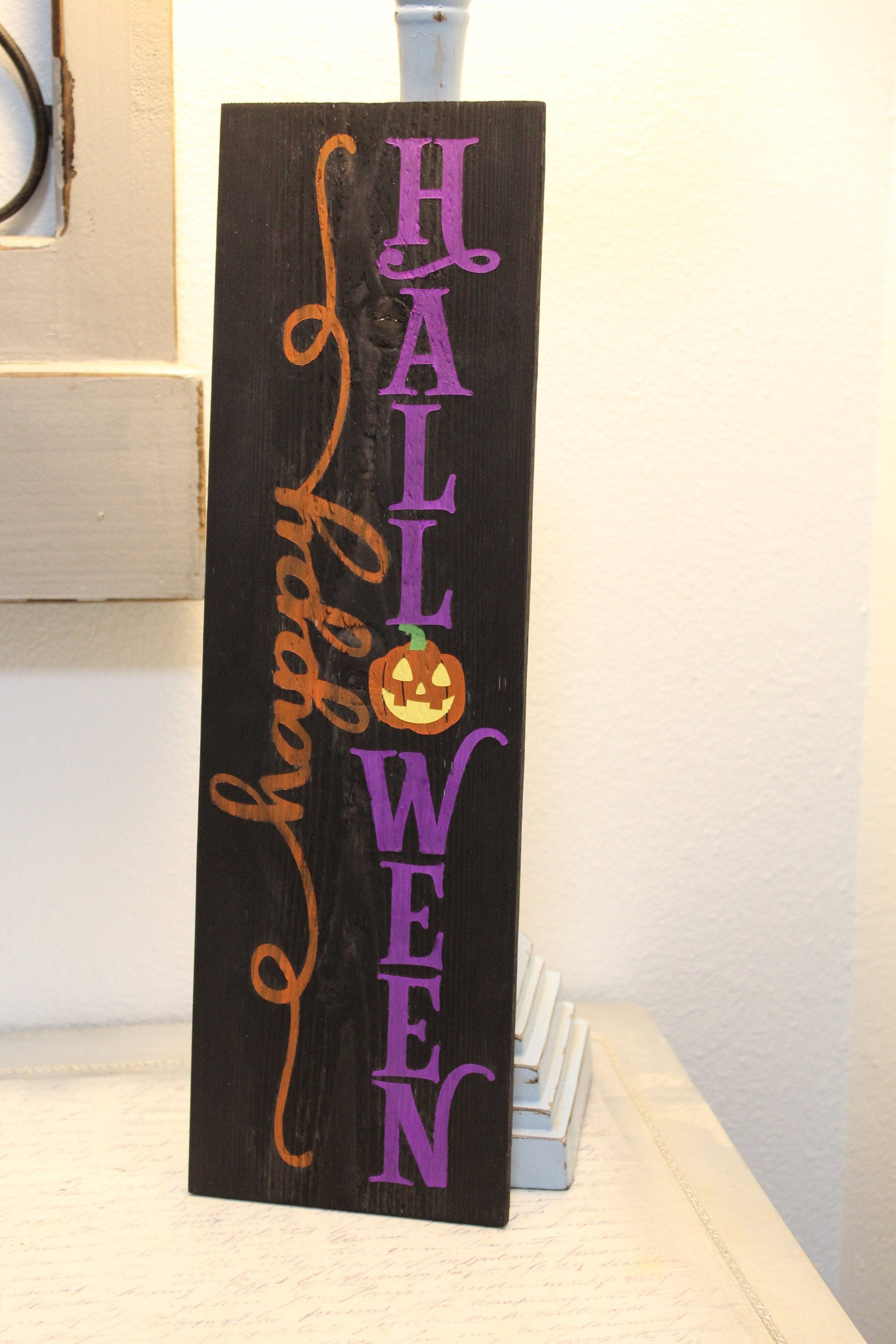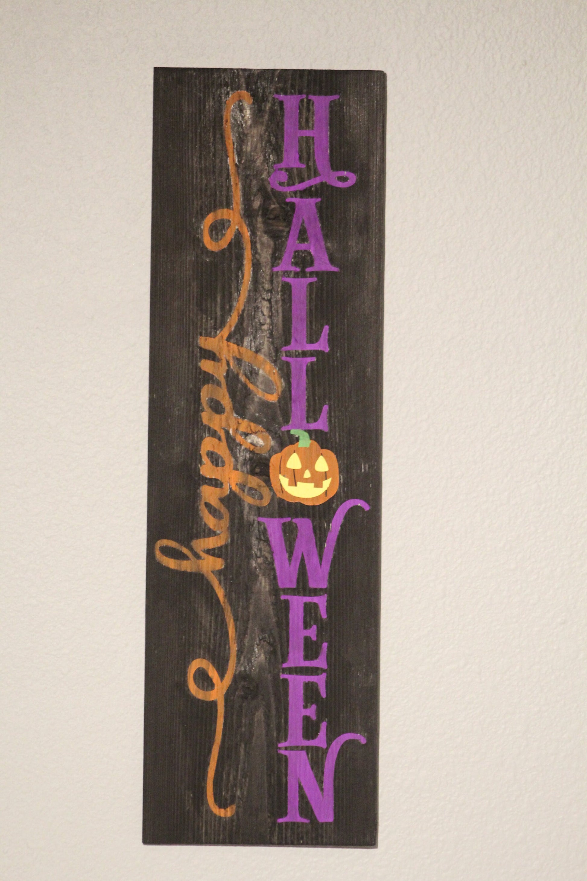 All of our signs are hand cut and painted. Each one is made to order and can be customized. This Happy Halloween sign is roughly 5" x 16". You can lean it as part of a display or hang it on the wall.