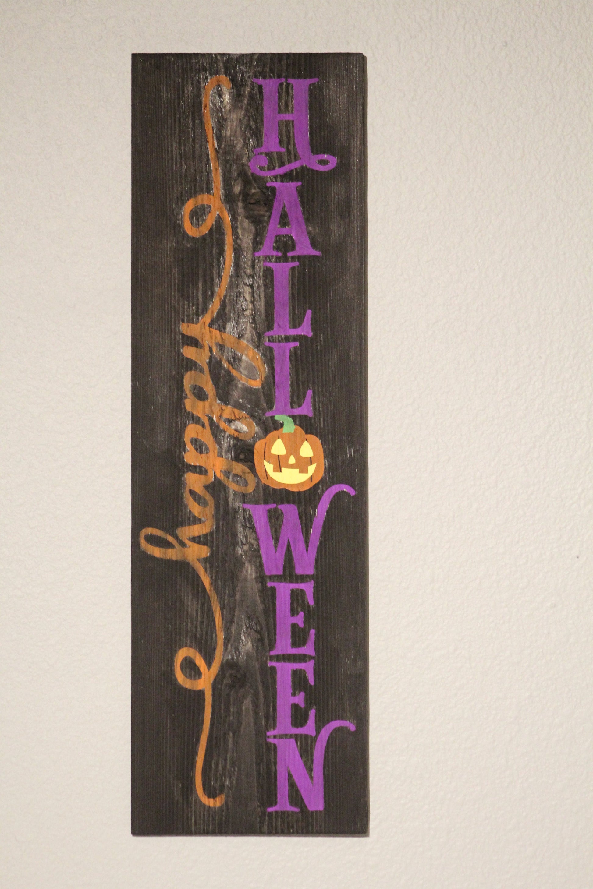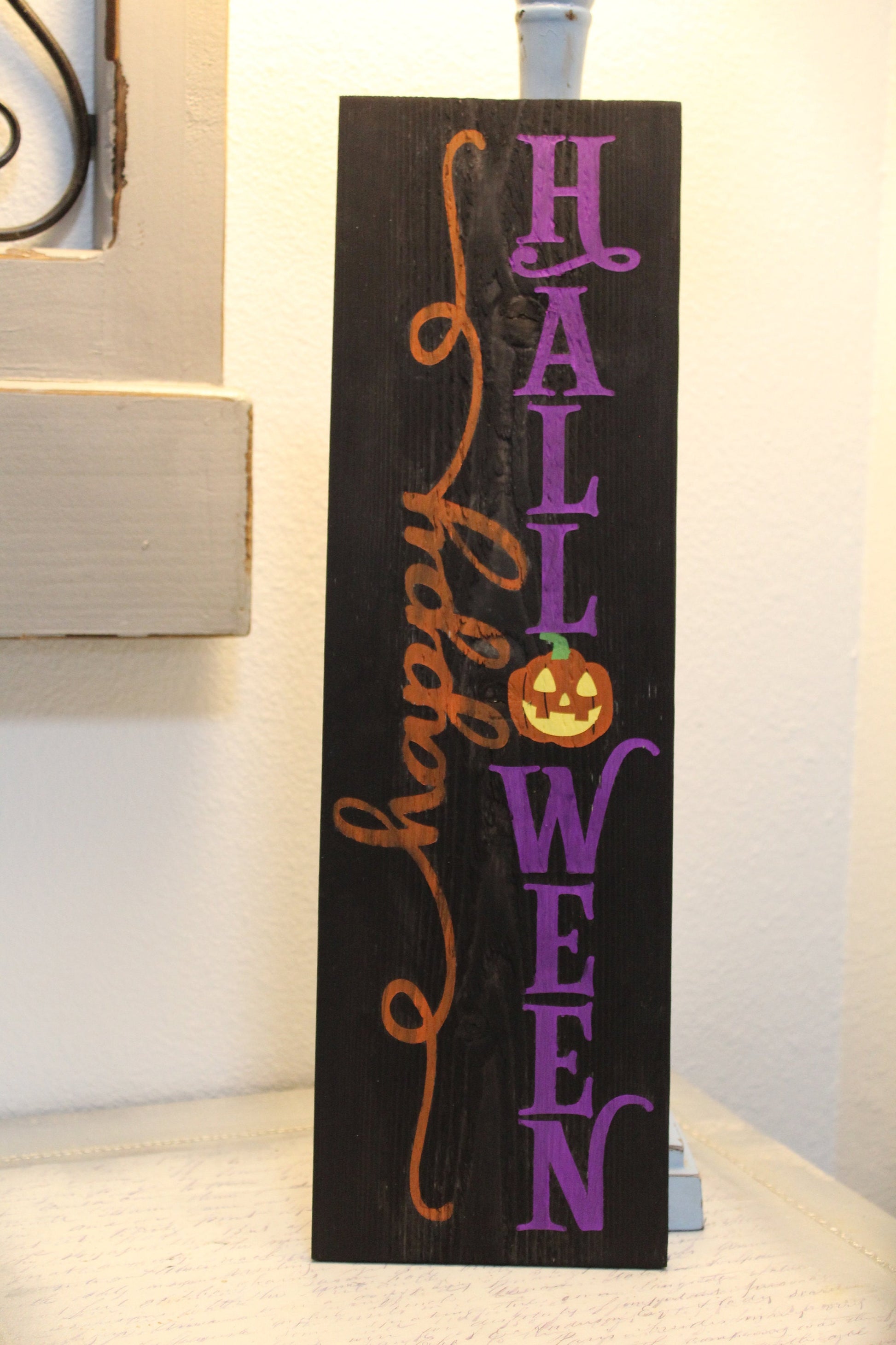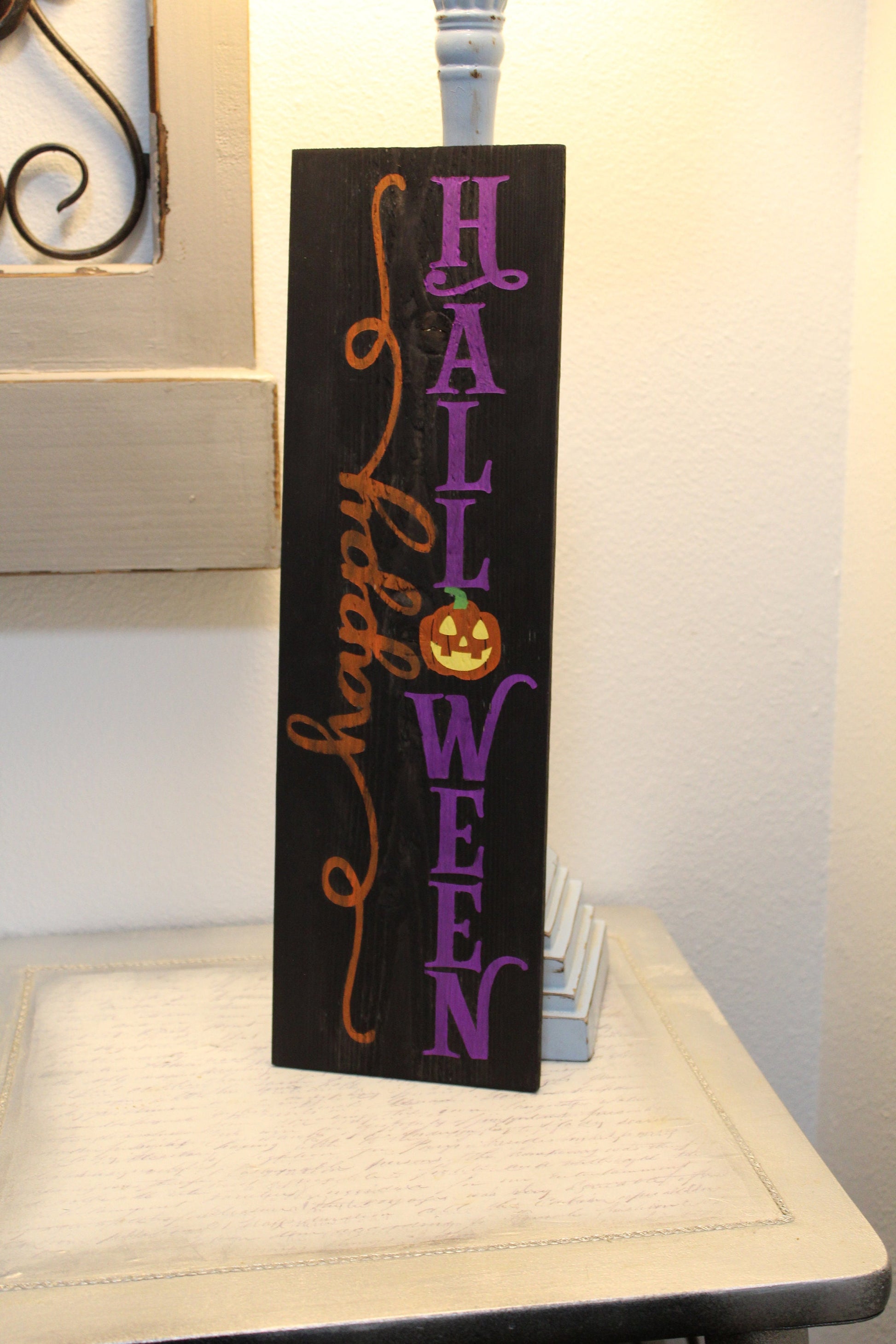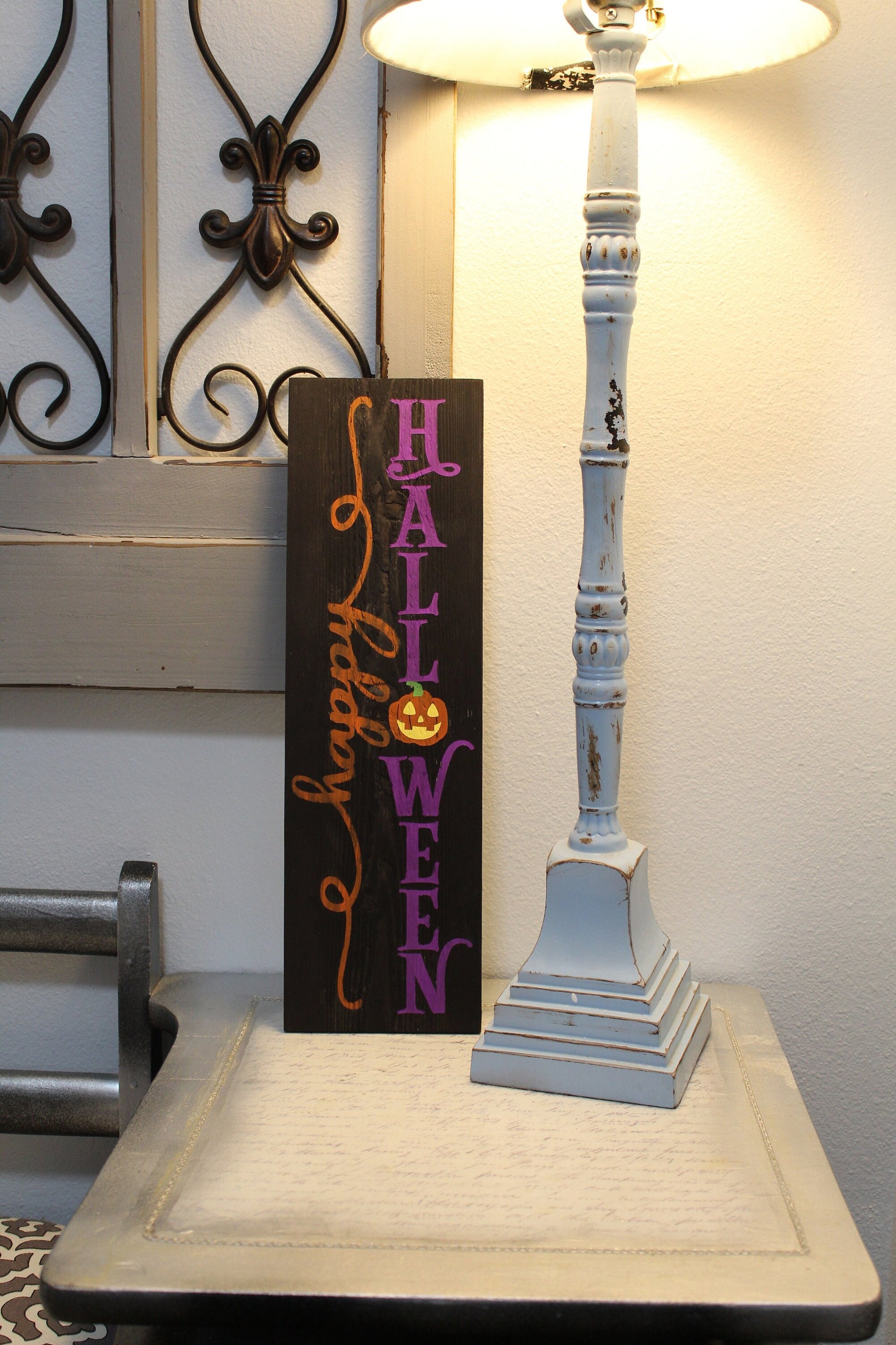 All of our signs are hand cut and painted. Each one is made to order and can be customized. This Happy Halloween sign is roughly 5" x 16". You can lean it as part of a display or hang it on the wall.