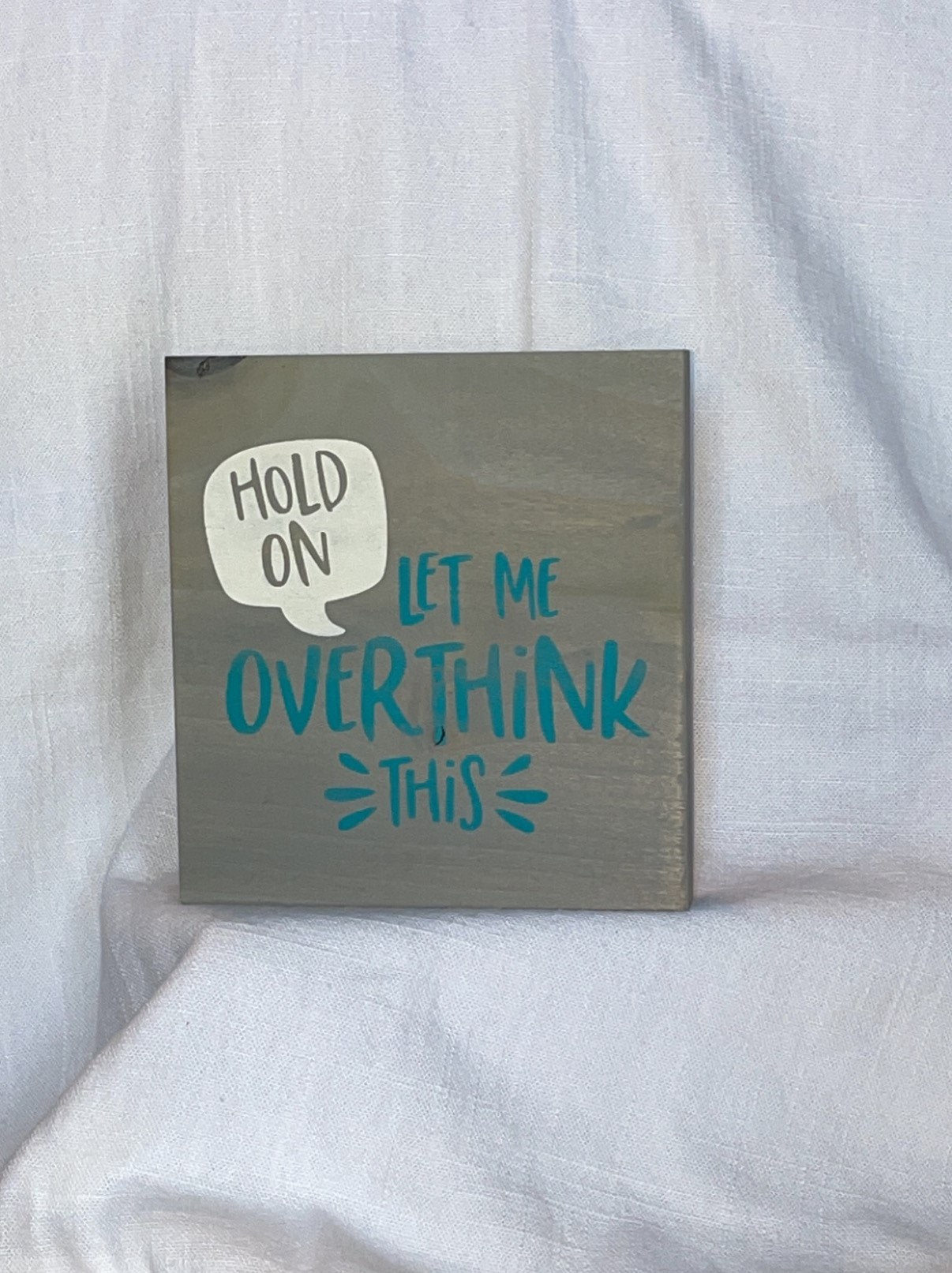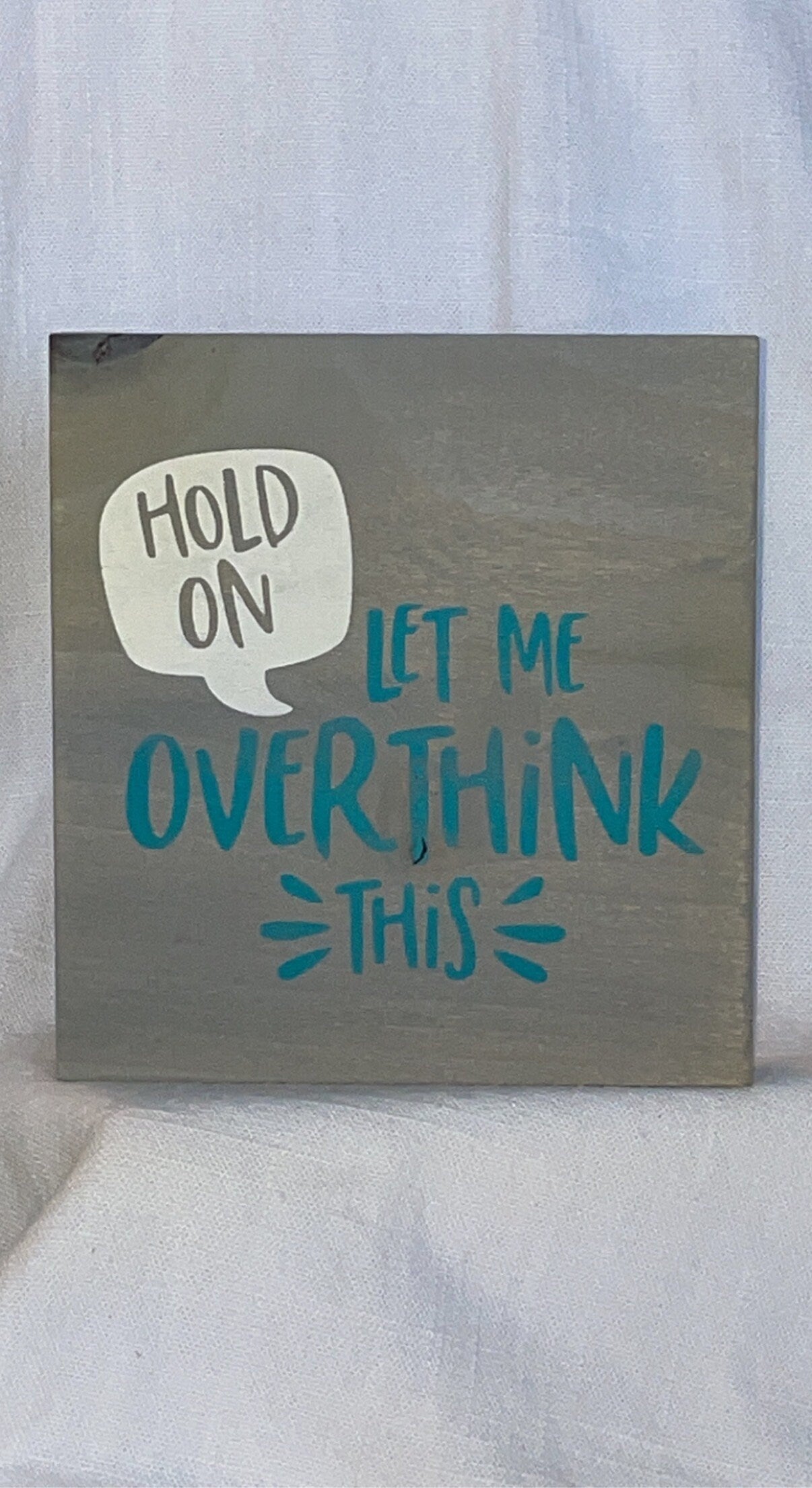 All of our signs and blocks are hand painted. Each one is made to order and can be customized. Want a different size? How about specific colors to match your decor? Shoot us a message with your order and we'll get it done! This Hold On Let me Overthink This display block is roughly 5.5" x 5.5" and painted on a rain grey wash background.
