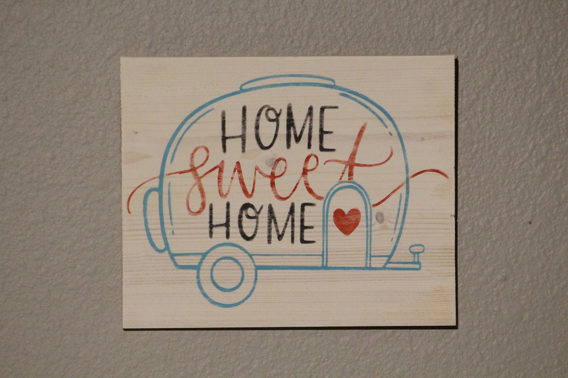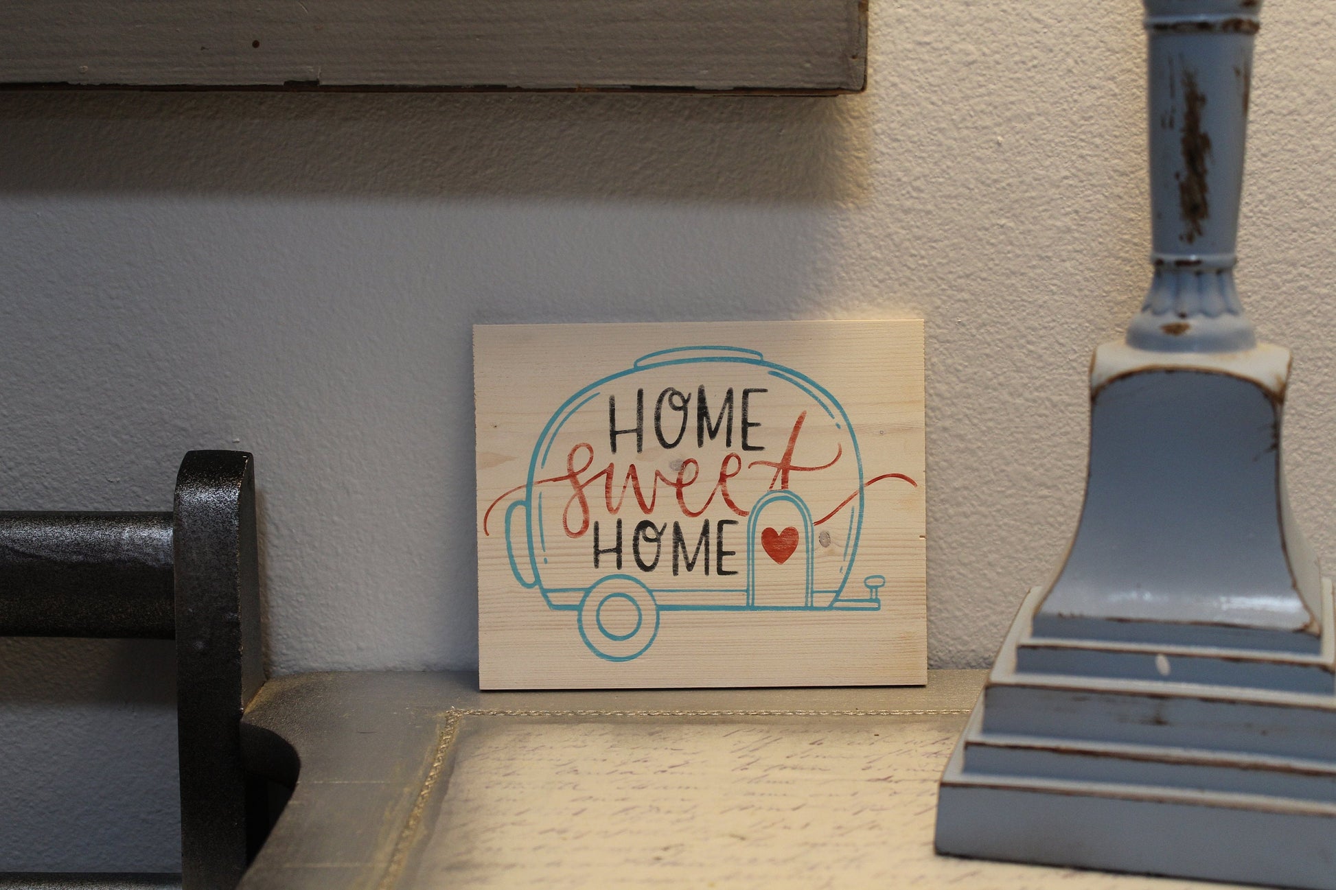 All of our signs and blocks are hand painted. Each one is made to order and can be customized. Want a different size? How about specific colors to match your decor? Shoot us a message with your order and we'll get it done! The Home Sweet Home Camper sign is roughly 5" x 6" and painted over a whitewash background.