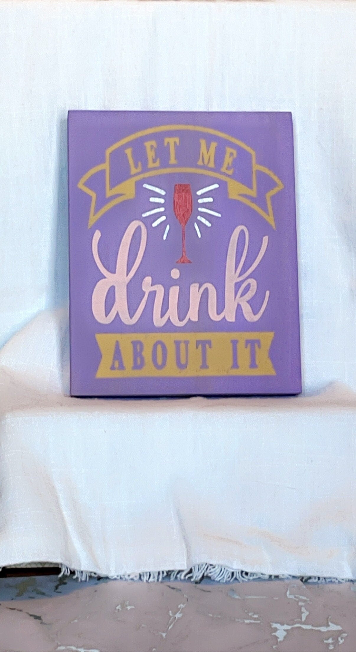 All of our signs are hand cut and painted. Each one is made to order and can be customized. Want a different size? How about specific colors to match your decor? Shoot us a message with your order and we'll get it done! Let me Drink about it sign is roughly 7.5" x 6" and painted on a light purple wash. In the photo shown, the wine glass is in a Metallic red color.