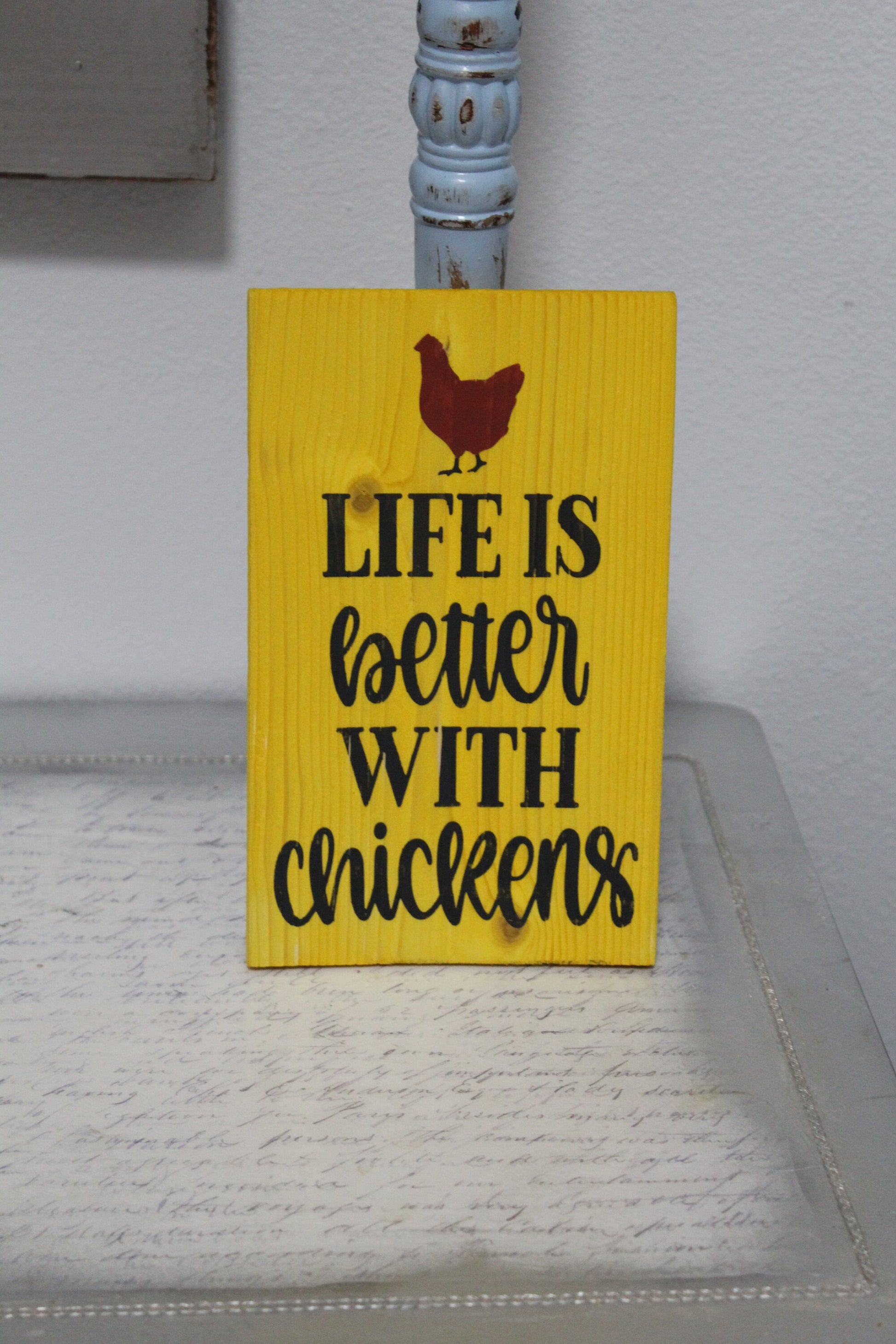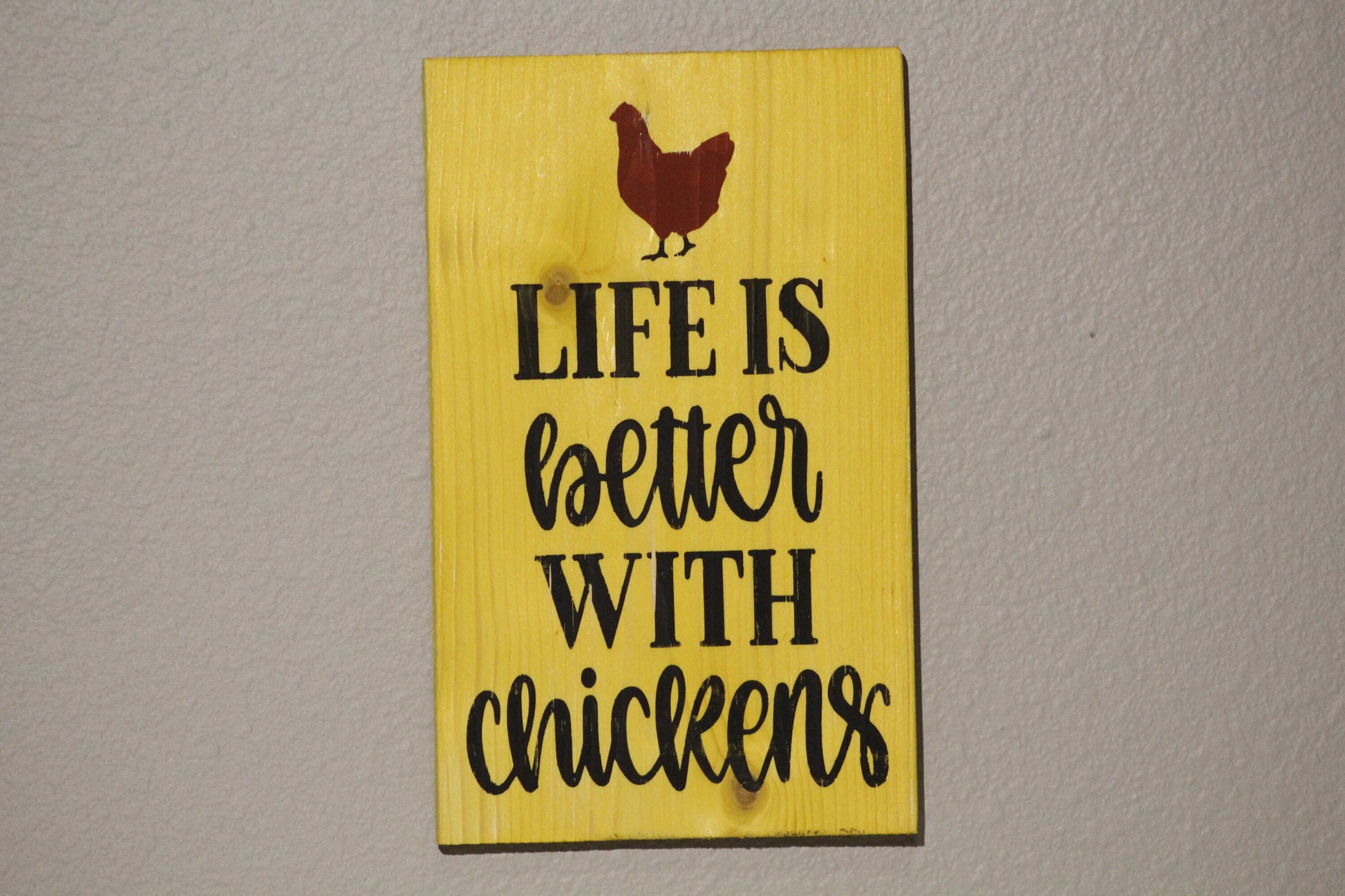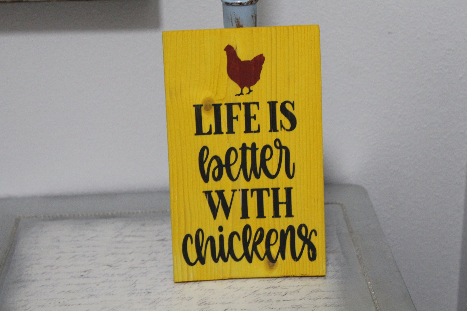 All of our signs and blocks are hand painted. Each one is made to order and can be customized. Want a different size? How about specific colors to match your decor? Shoot us a message with your order and we'll get it done! The Life is Better with Chickens sign is roughly 8" x 5" and painted on a lemonade color background.
