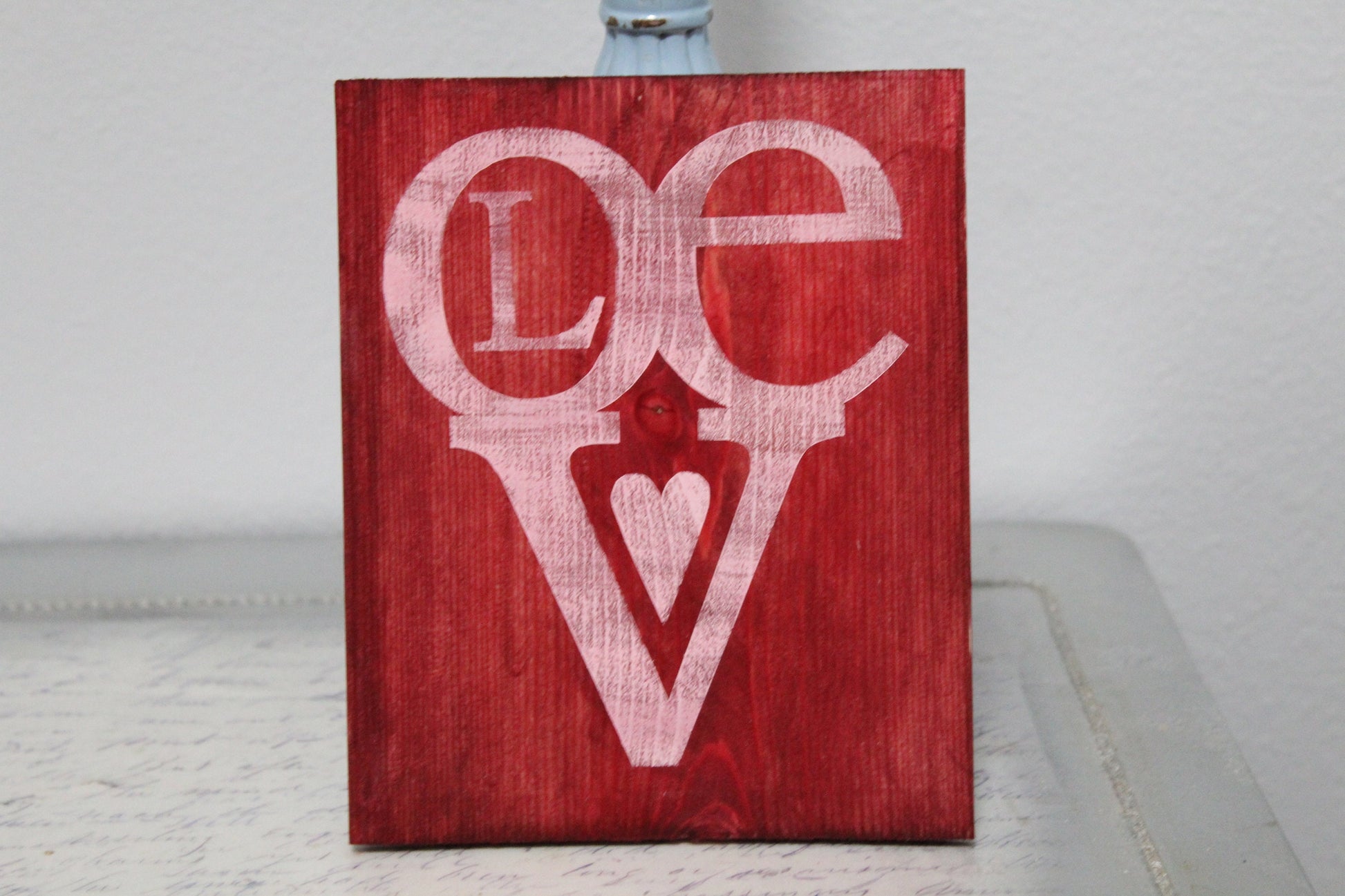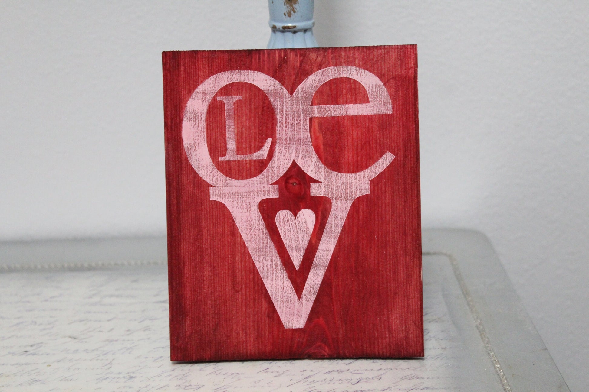 All of our signs and blocks are hand painted. Each one is made to order and can be customized. Want a different size? How about specific colors to match your decor? Shoot us a message with your order and we'll get it done! Love sign is roughly 5.5" x 5" and painted on a red wine color background.