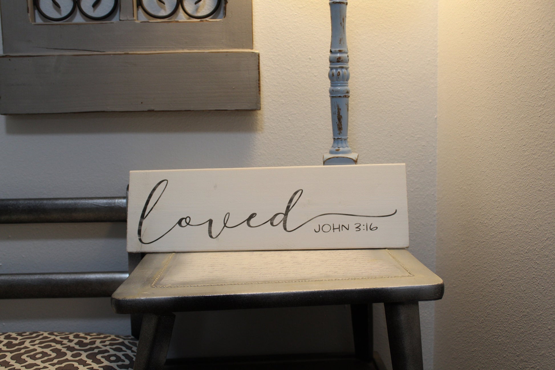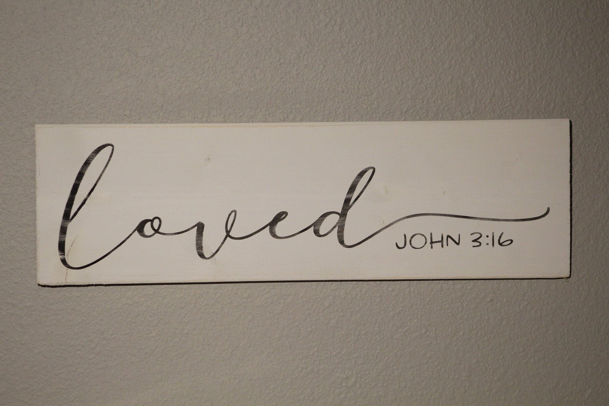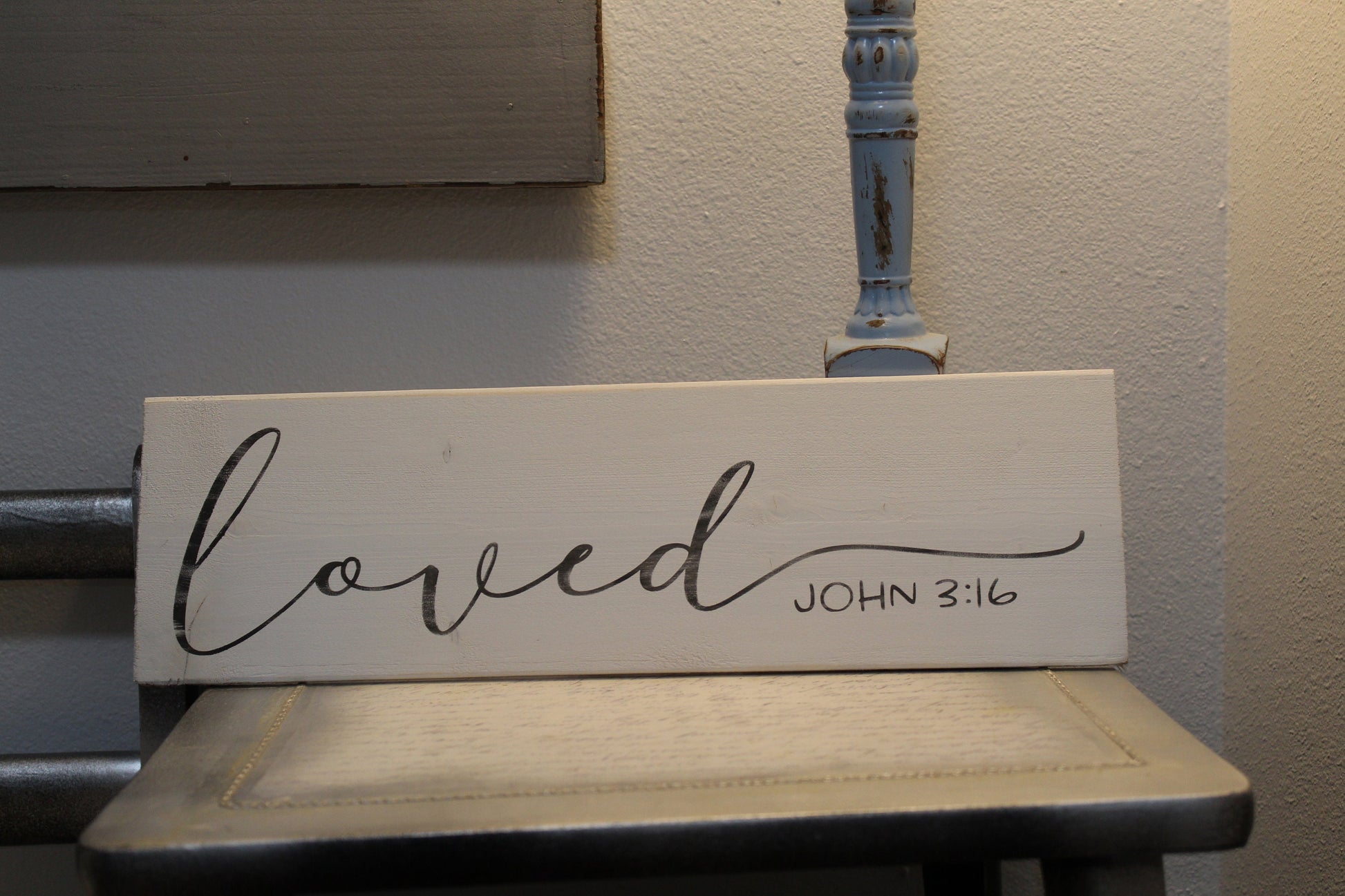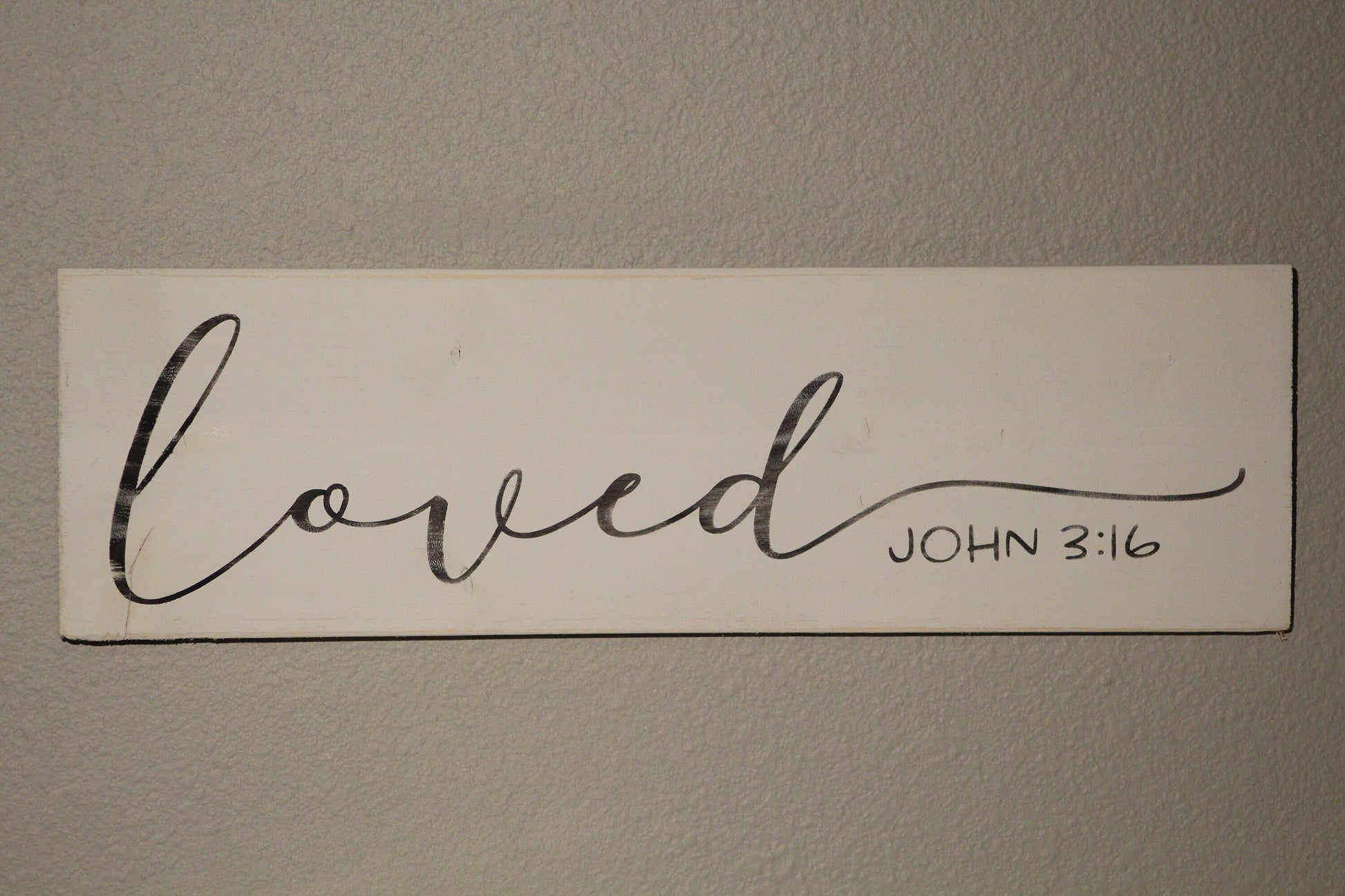 All of our signs are hand cut and painted. Each one is made to order and can be customized. Want a different size? How about specific colors to match your decor? Shoot us a message with your order and we'll get it done! The Loved John 3:16 sign is roughly 5" x 16".
