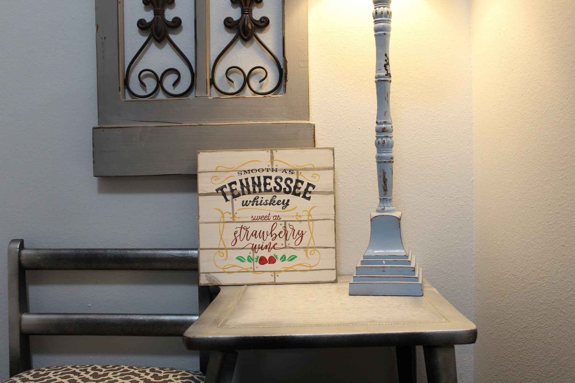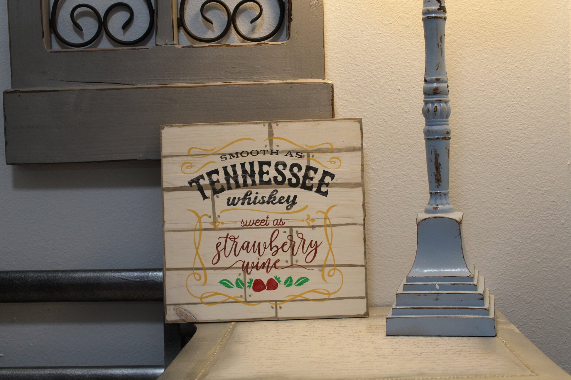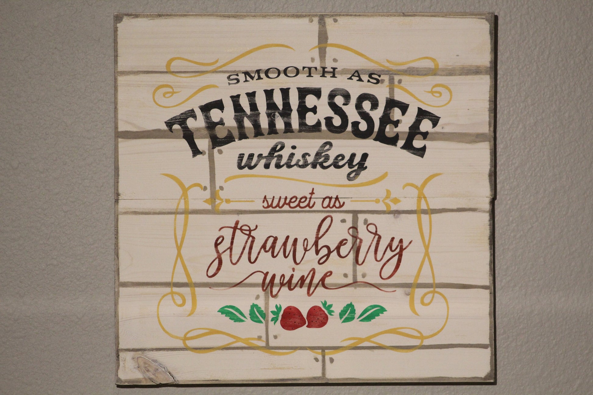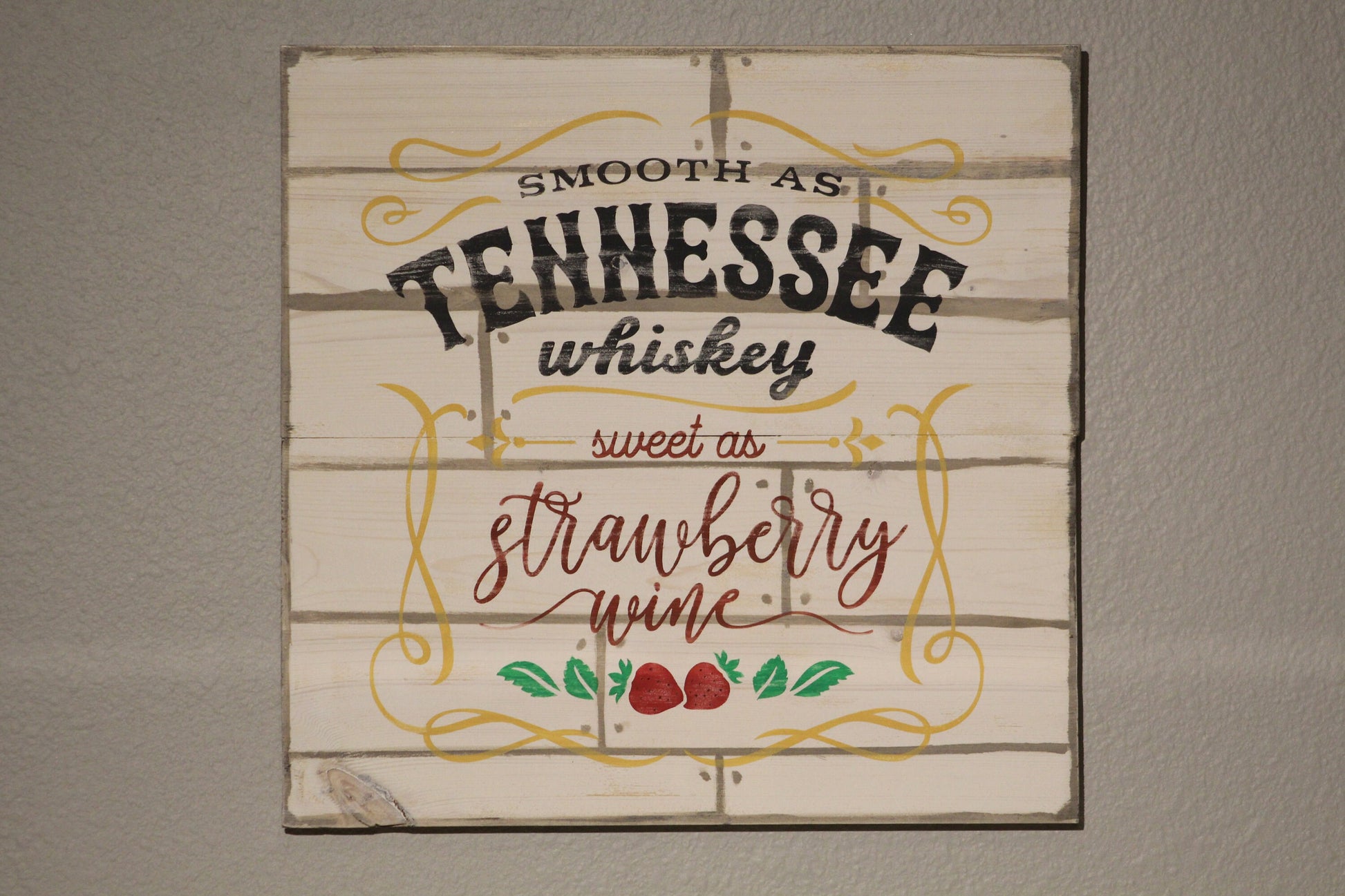 All of our signs are hand cut and painted. Each one is made to order and can be customized. This Smooth as Tennessee Whiskey Sweet as Strawberry Wine sign is roughly 10" x 10". You can lean it as part of a display or hang it on the wall. Can also be personalized.