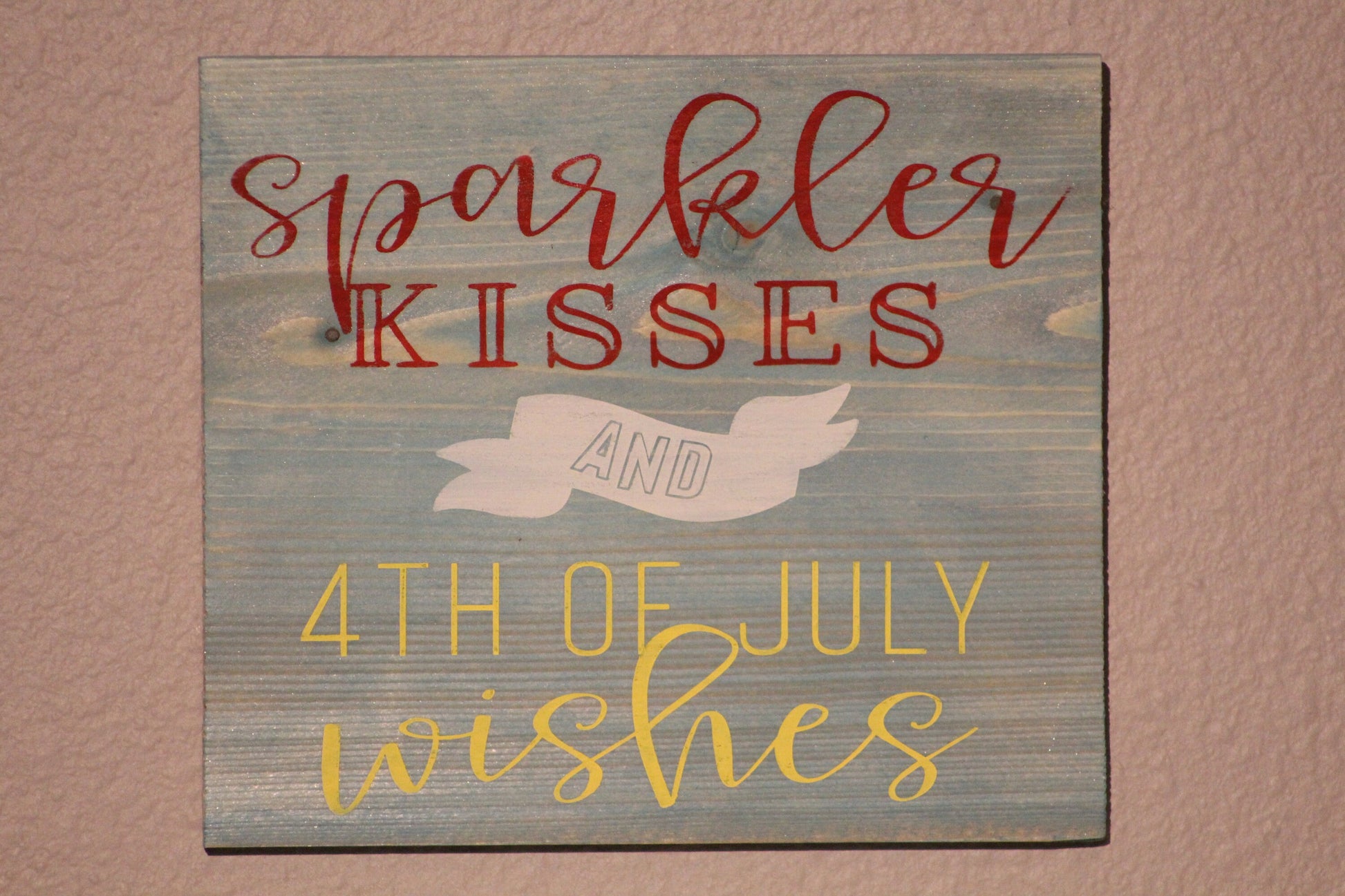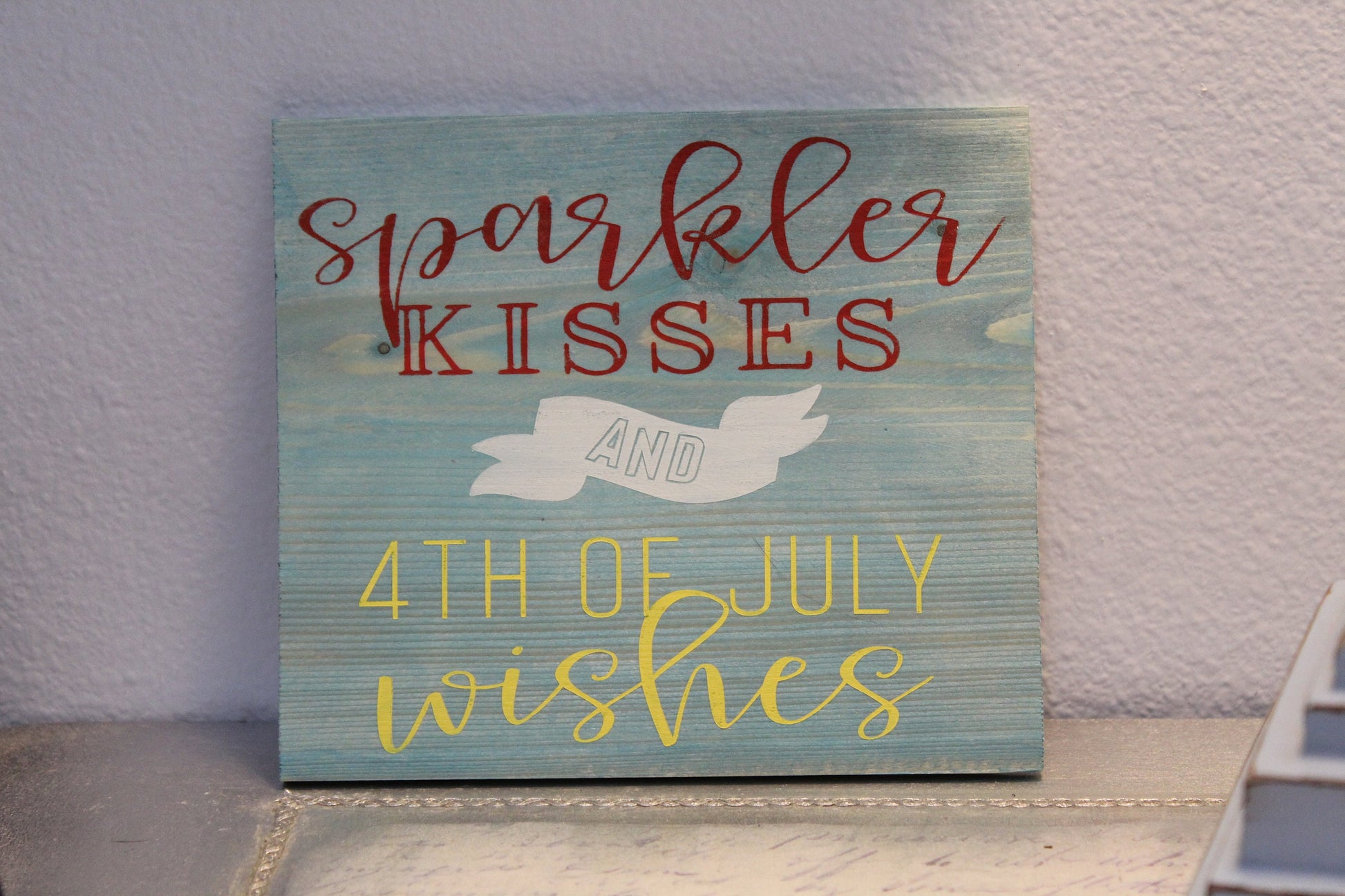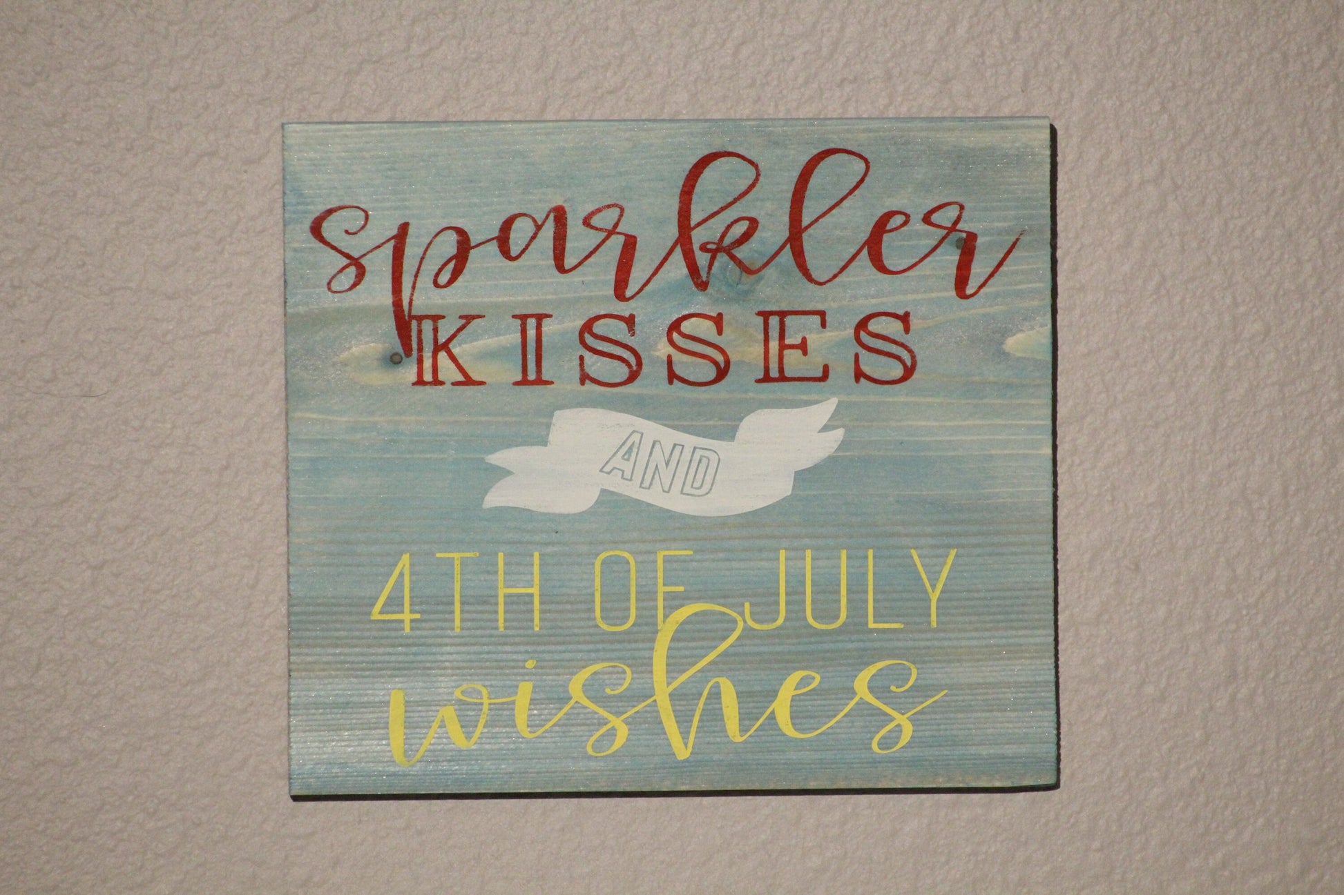 All of our signs are hand cut and painted. Each one is made to order and can be customized. Want a different size? How about specific colors to match your decor? Shoot us a message with your order and we'll get it done! The Sparkler Kisses and 4th of July Wishes sign is roughly 5" x 5.5". Painted on a light blue wash background. You can lean it as part of a display or hang it on the wall.