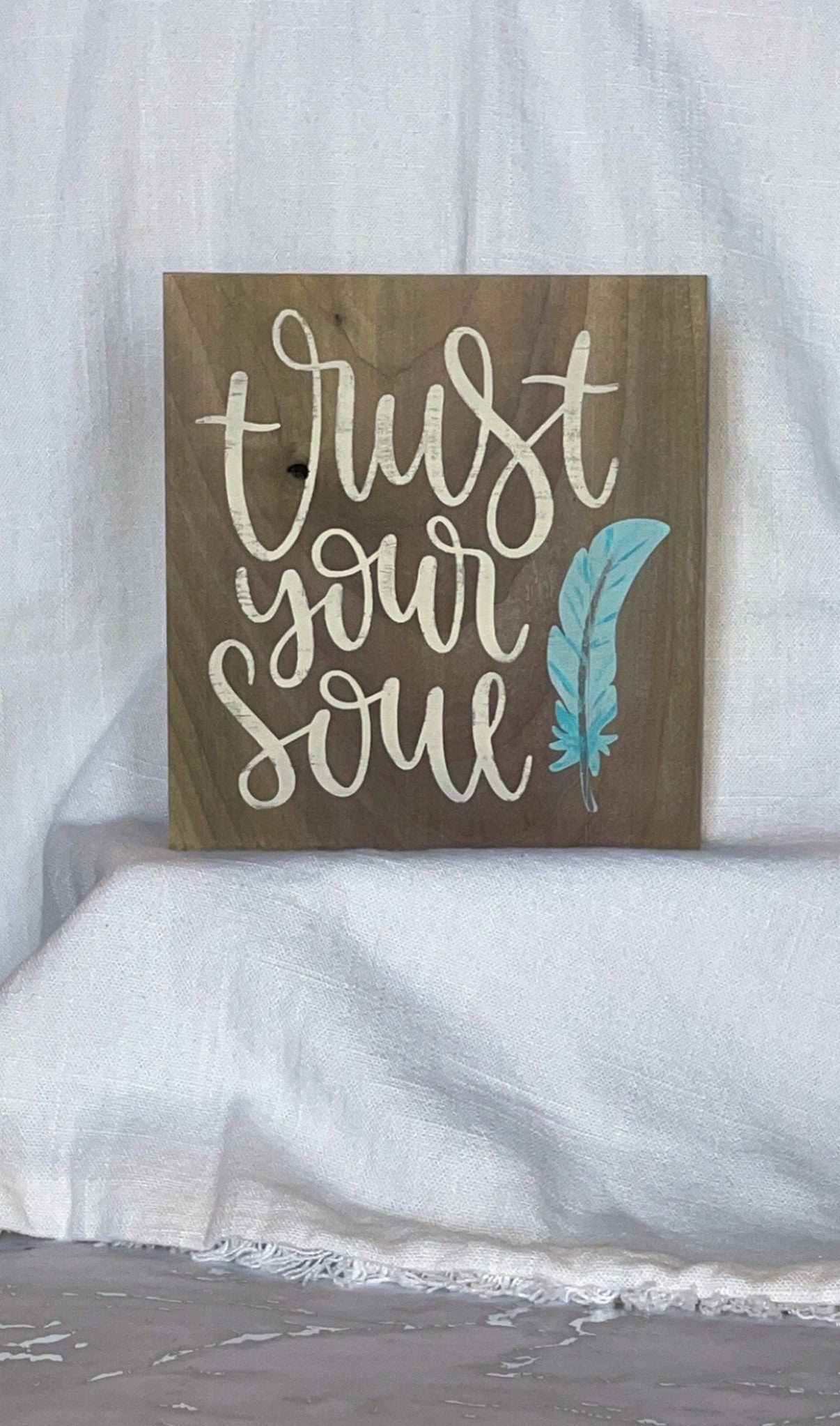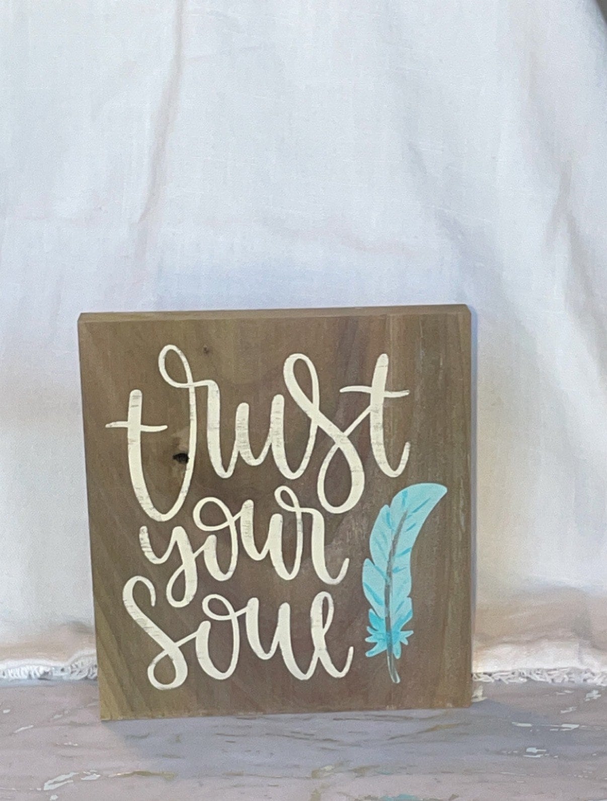 All of our signs and blocks are hand painted. Each one is made to order and can be customized. Want a different size? How about specific colors to match your decor? Shoot us a message with your order and we'll get it done! This Trust Your Soul display block is roughly 6.5" x 6" and painted on natural wood.