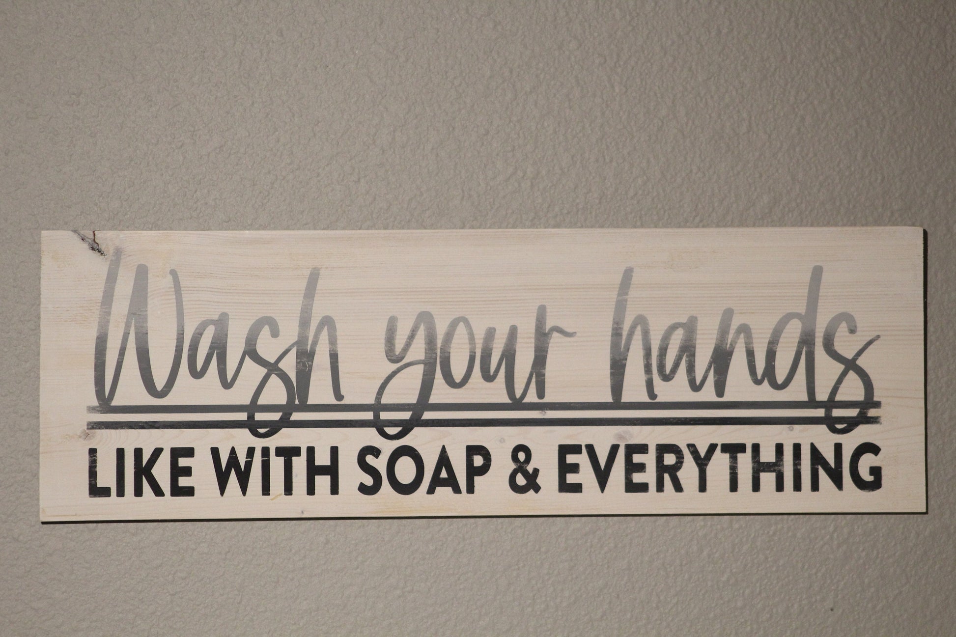 All of our signs are hand cut and painted. Each one is made to order and can be customized. This Wash your hands like with soap & everything sign is roughly 5" x 15". You can lean it as part of a display or hang it on the wall. Can also be personalized. Color pictured is a light gray that fades down into charcoal.
