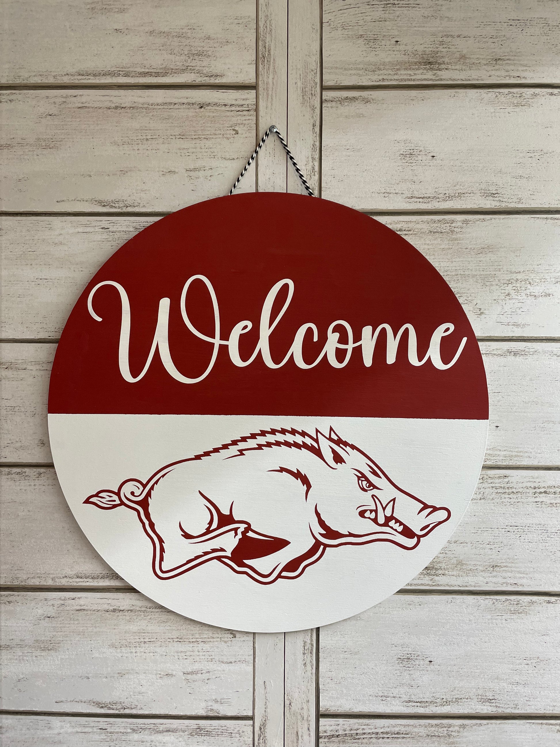 Listing is for (1) 18” round Welcome with an Arkansas Razorbacks logo wood sign.