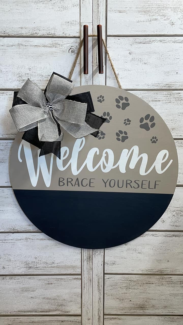 Listing is for (1) 18” round Welcome Brace Yourself wood sign.