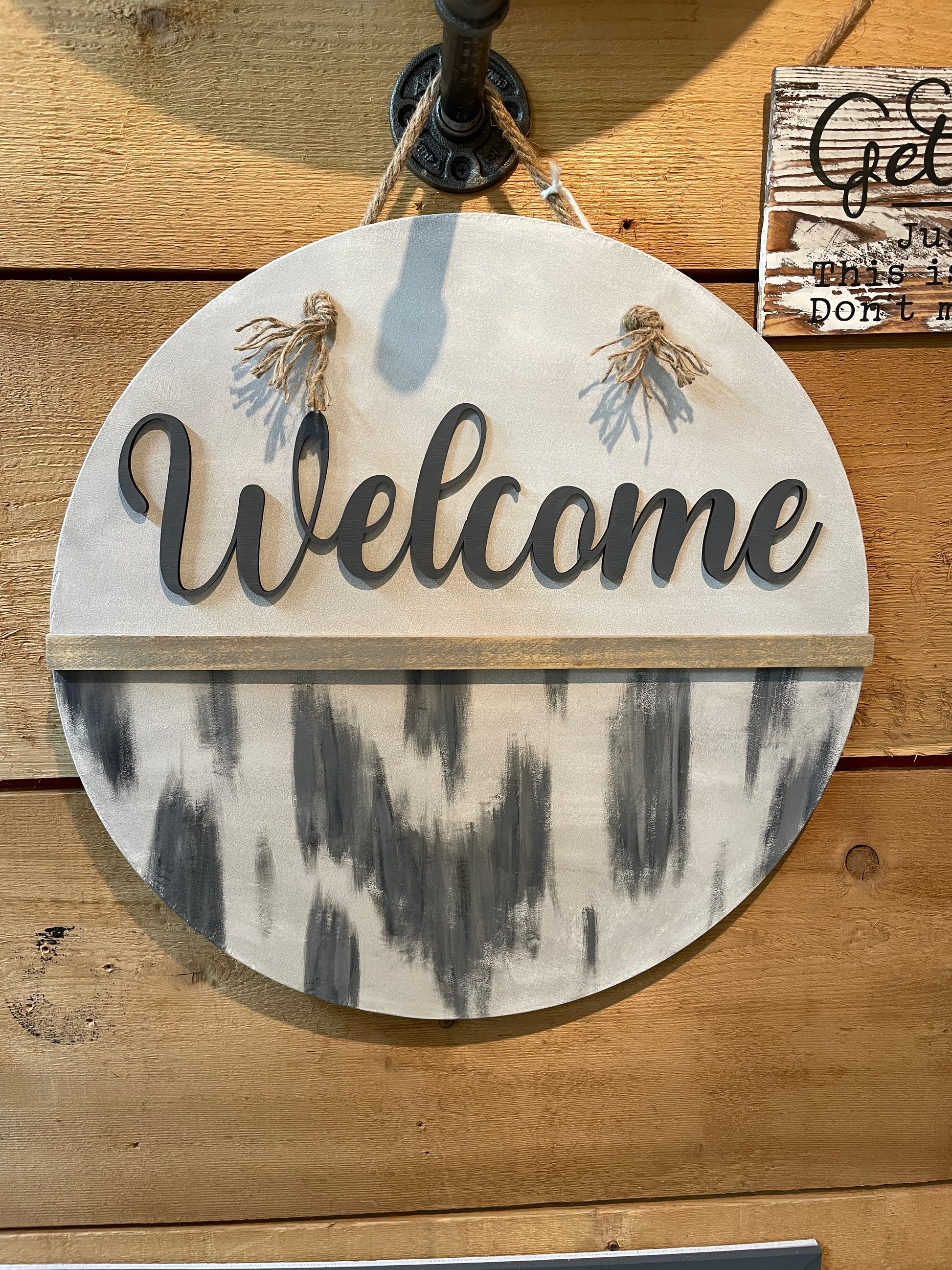 Listing is for (1) 18” round 3D Welcome Cowhide hand painted wood sign.