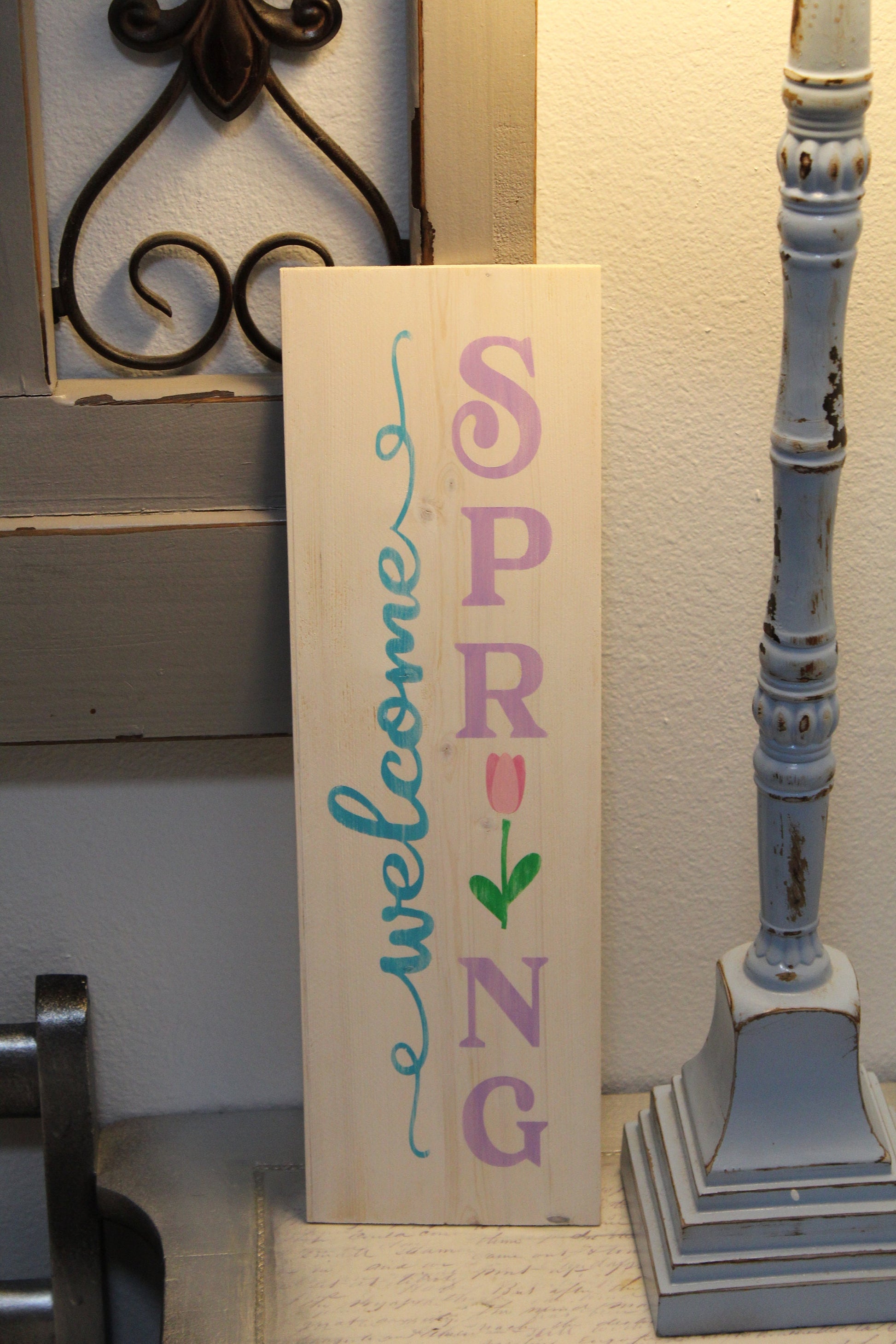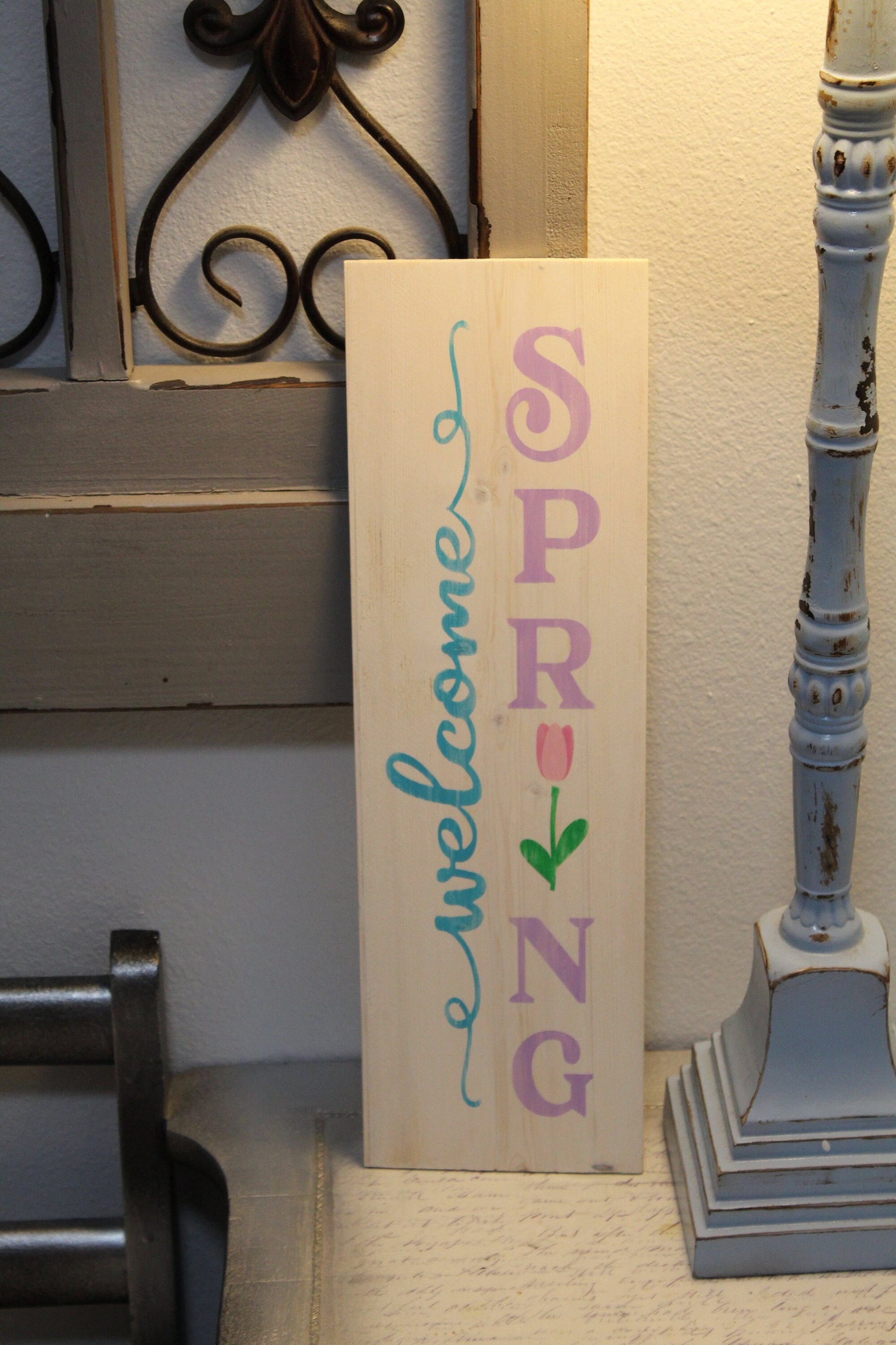 All of our signs are hand cut and painted. Each one is made to order and can be customized. The Welcome Spring sign is roughly 5" x 16". You can lean it as part of a display or hang it on the wall.