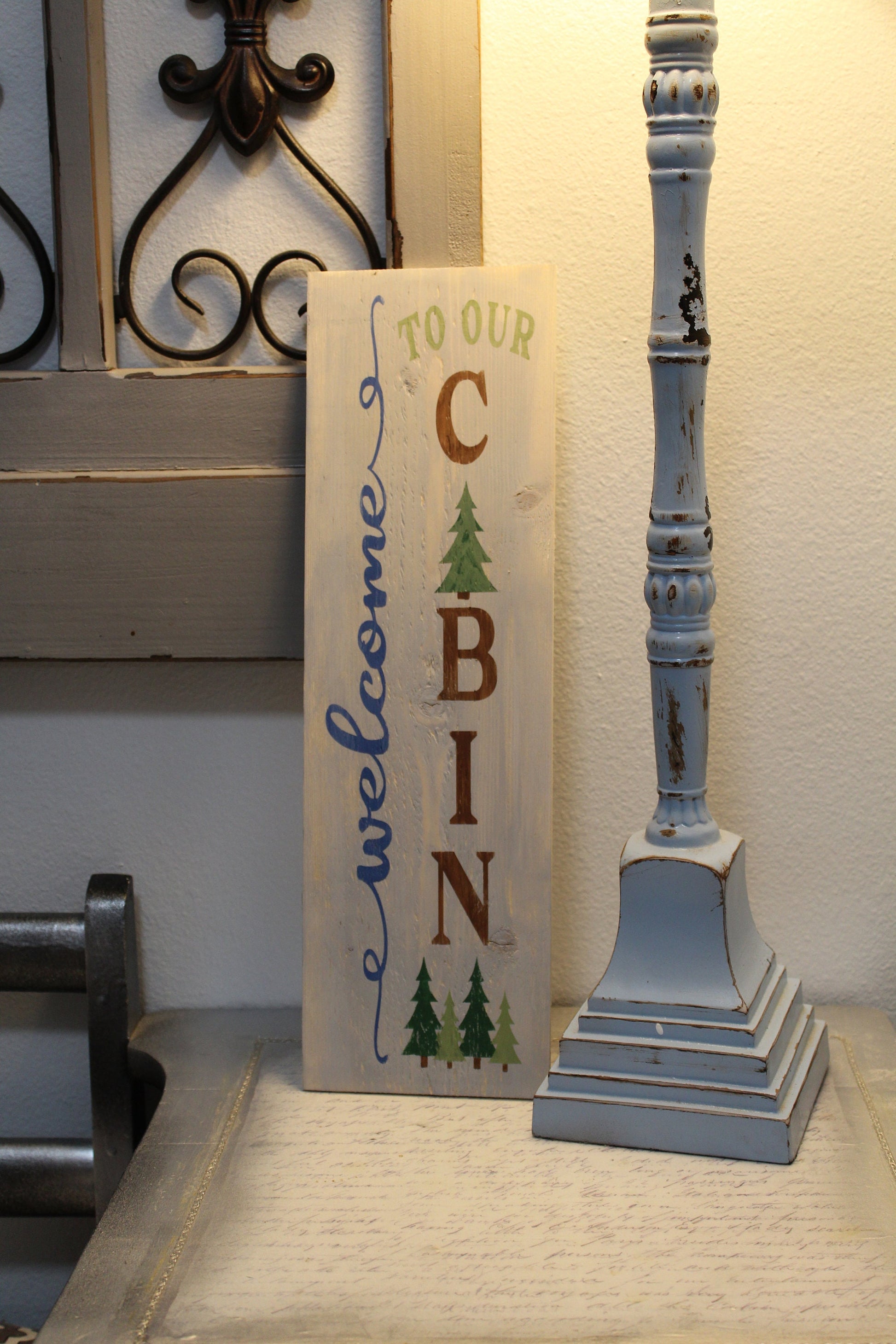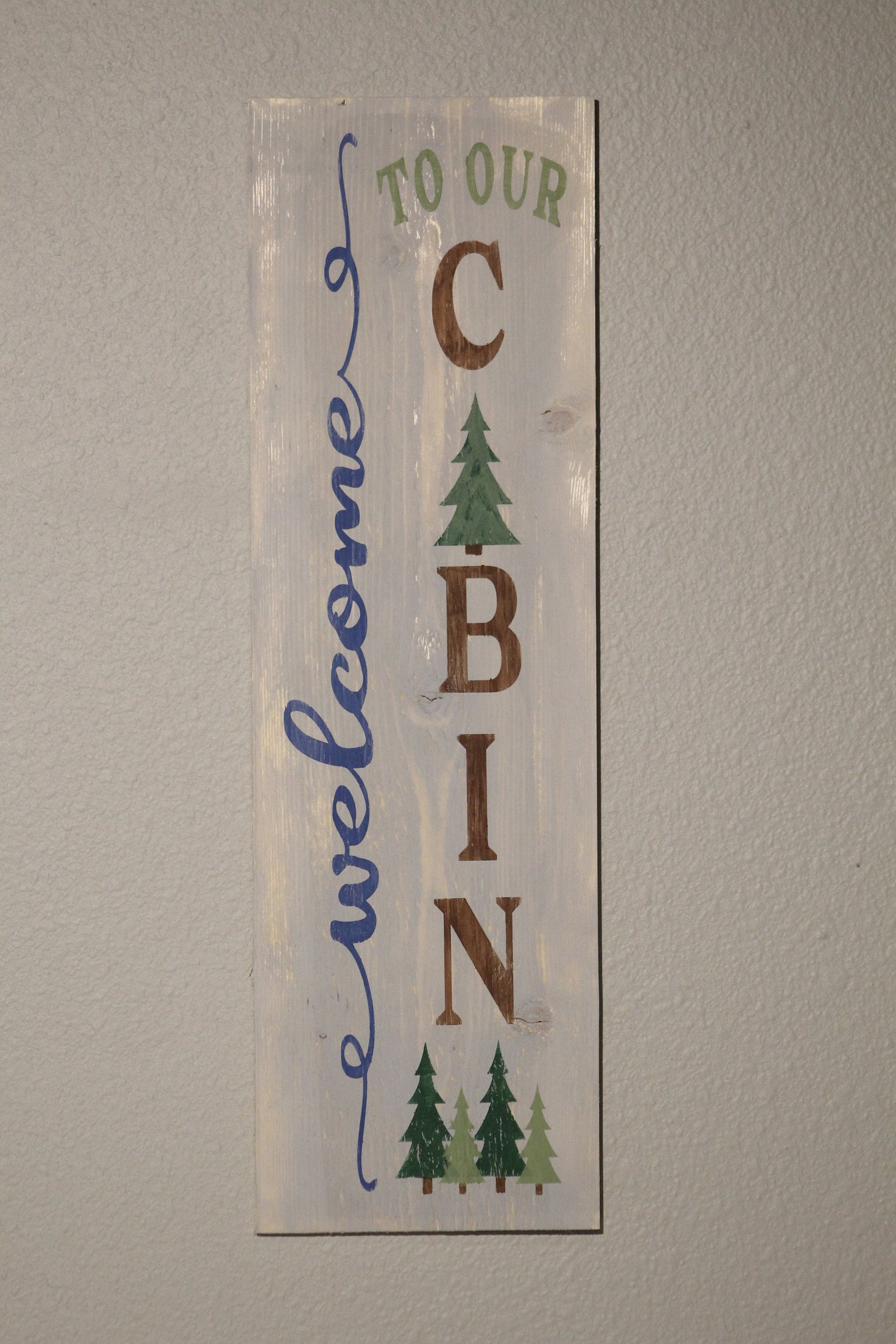 All of our signs are hand cut and painted. Each one is made to order and can be customized. This Welcome to our Cabin sign is roughly 5" x 16". You can lean it as part of a display or hang it on the wall. Can also be personalized.