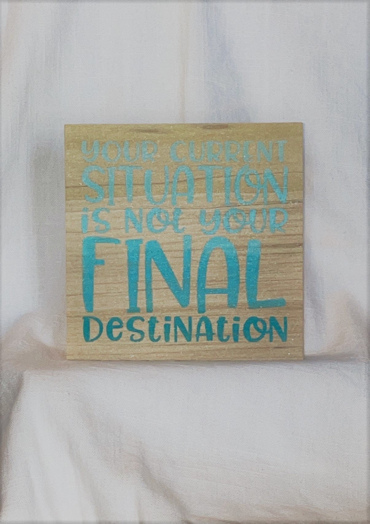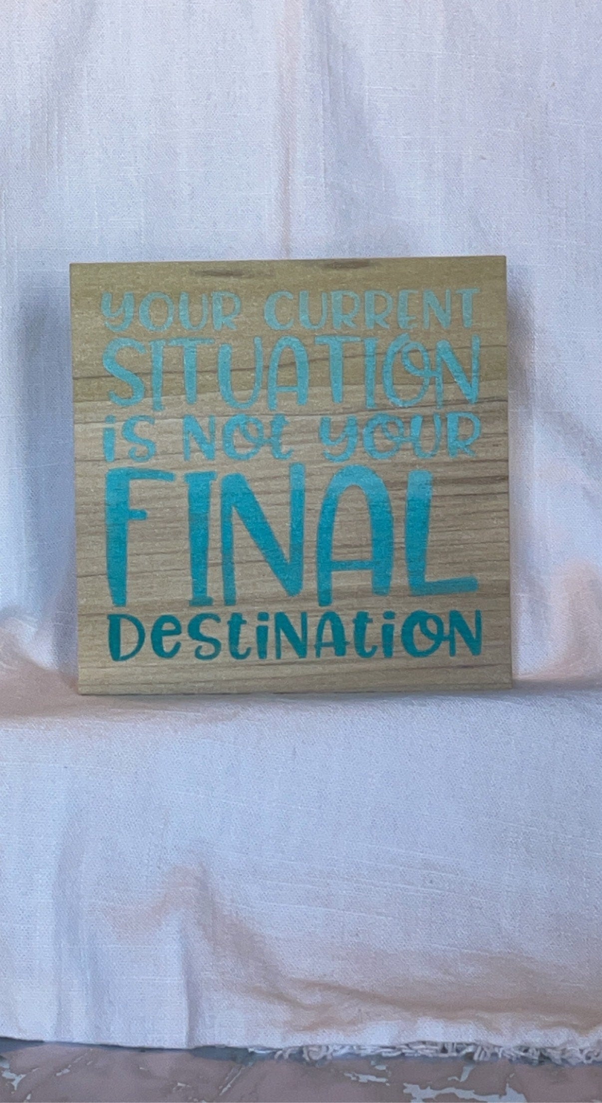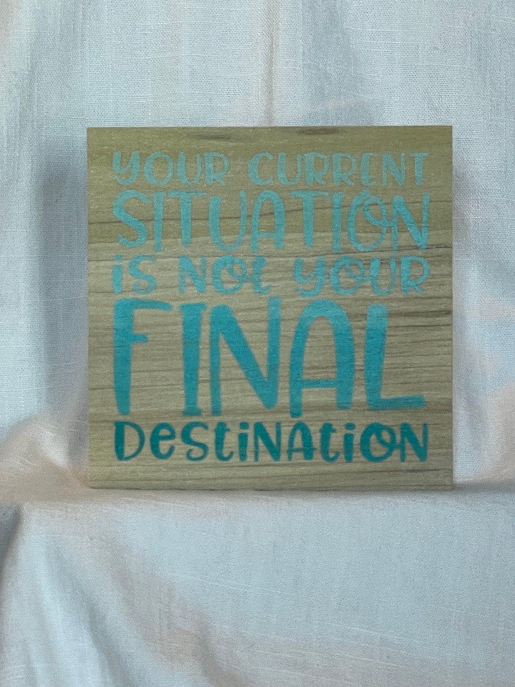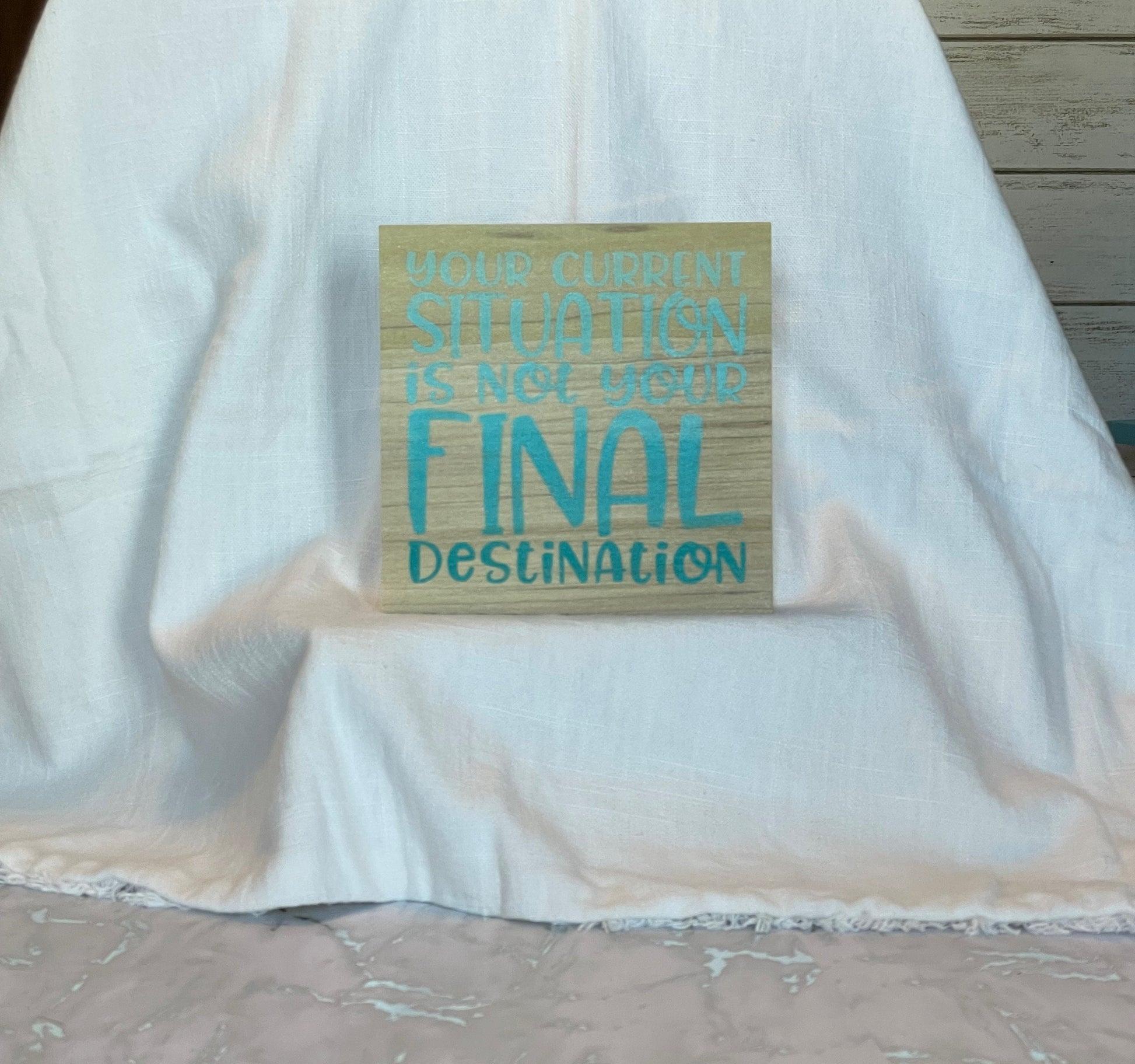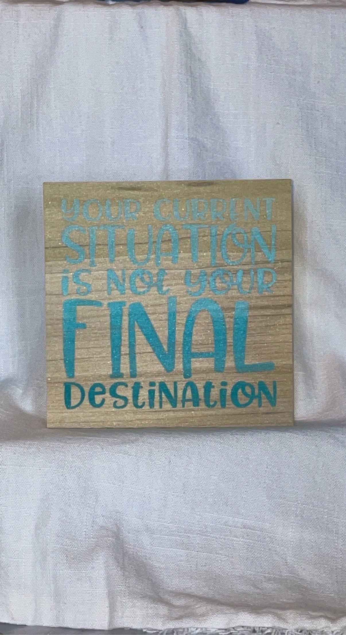 All of our signs and blocks are hand painted. Each one is made to order and can be customized. Want a different size? How about specific colors to match your decor? Shoot us a message with your order and we'll get it done! The Your Current Situation is not your Final Destination display block is roughly 6" x 6" and painted on natural wood with a shimmer finish.